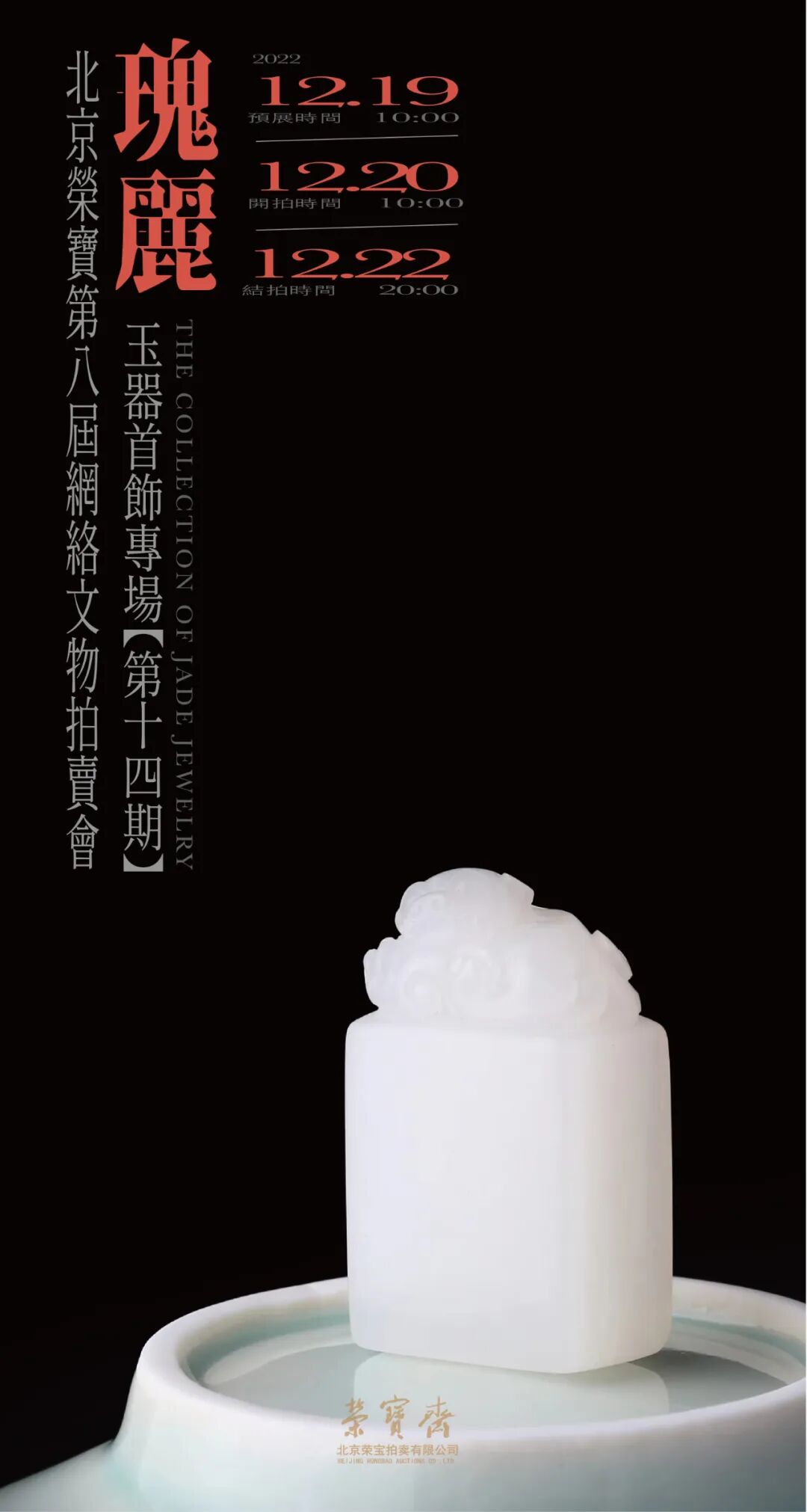 北京荣宝第八届网络文物拍卖会——瑰丽·玉器首饰专场(第十四期)将于12月19日10:00—12月20日10:00开启线上预展,并于12月20日10:00开拍,12月22日20:00结拍。
