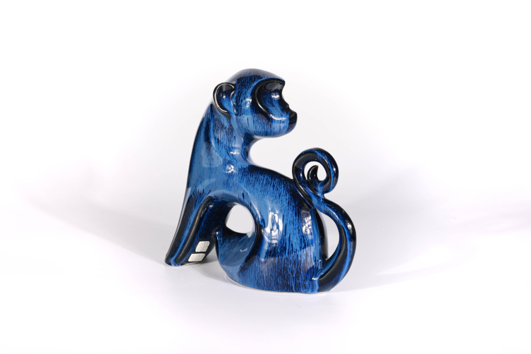 生肖猴摆件造型灵动,妙趣横生,它回首观望,神态轻松愉悦,幽蓝色的釉色给小猴子蒙上了一层神秘的面纱。