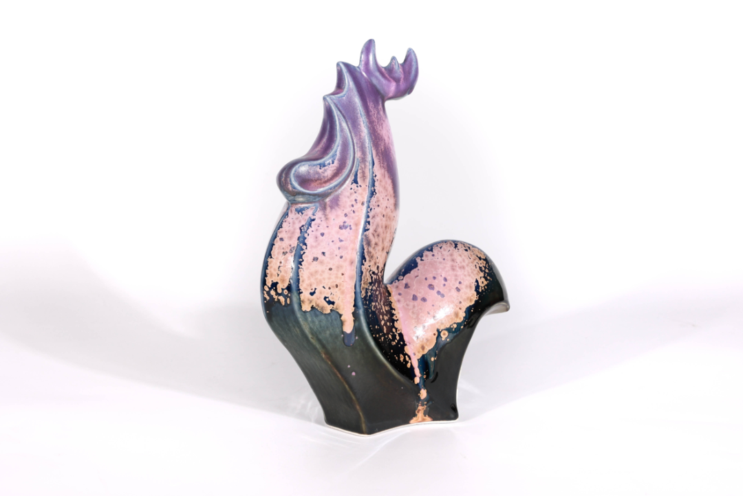 生肖鸡昂首挺胸,引颈向天,做出一副引吭高歌的架势,鸡冠冲天,充满干劲,它的身体由黑釉与红色釉斑组成,威武雄壮,色彩鲜明。
