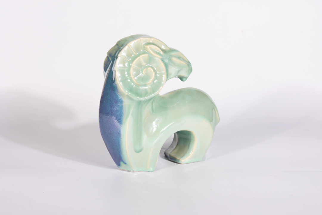 生肖羊的胎体施以两种不同的高温颜色釉,两种颜色搭配相得益彰,清润的釉色自然,与羊的气质极为贴合。
