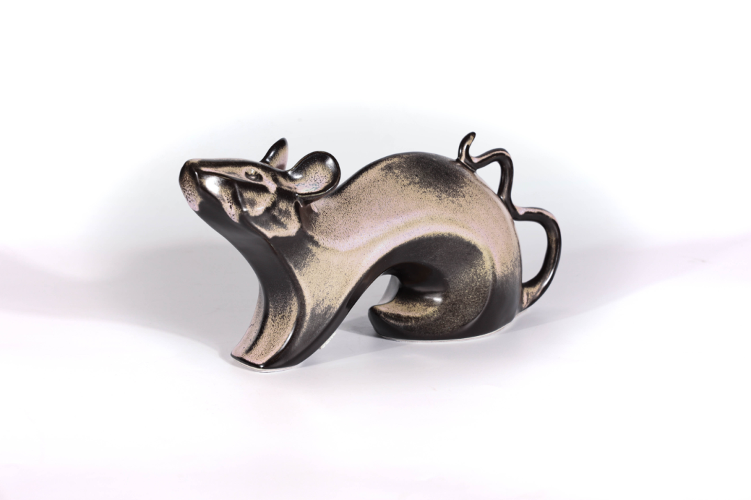 任峰老师的陶瓷鼠,利用独特釉面仿制出老鼠毛发竖立的观感,整体叠加一层金属光泽,更契合财的寓意。