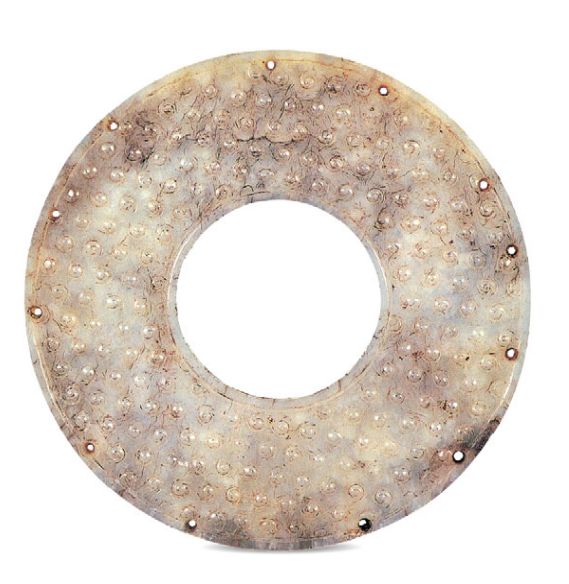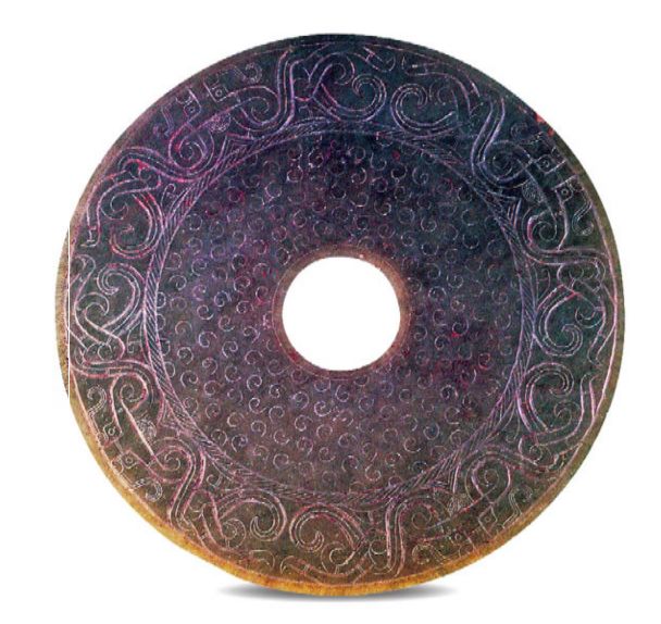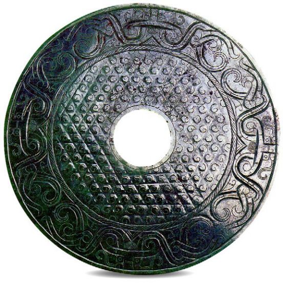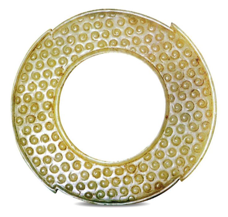 Ⅰ式:青玉质,扁平圆形,内外缘各饰阴线纹一周,中间以绞丝纹圈带为界,分为内外区。内区饰涡纹,隐见蒲纹为地;外区饰细阴线刻双身兽面纹,兽首向外。两面纹饰相同,制作精细,通体抛光。直径23厘米,孔径4.6厘米, 厚0.4~0.55厘米