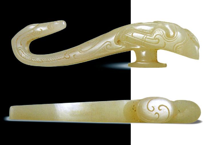 白玉质,钩头作鸭首状,躯体呈“S”形,器表腹部浅浮雕卷云纹,边缘阴刻短平行斜线纹、云气纹、网格纹等。背部椭圆形纽,纽柱较高,纽面阴刻三涡纹。通体光滑圆润,制作规整精细。