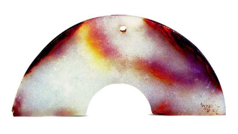 Ⅲ式:长6.6厘米,宽2.4厘米, 厚0 .3厘米。白玉质,局部黄褐色沁,体扁平短弧状,双首合体龙形。器表双面雕,两面纹饰风格特征不同:正面(以细浅双阴线雕琢简化龙首纹,上部龙首五官形构较完整,叠压在下部龙首纹上,整图纹饰繁密,口部反向斜刀雕琢呈“S”形,具有春秋晚期器的特征;背面则以粗阴线深浮雕繁密蟠螭纹。两端龙首及龙口部穿孔大小不等,弧背近缘部有一小孔径圆穿。从玉璜双面雕琢纹饰的风格特征看,此器应是利用早期玉璜二次改刻加工而成。汉代玉作中,利用前代遗物作二次加工处理的“改刻器”较多,本式璜是研究汉玉改刻工艺的重要实物材料。