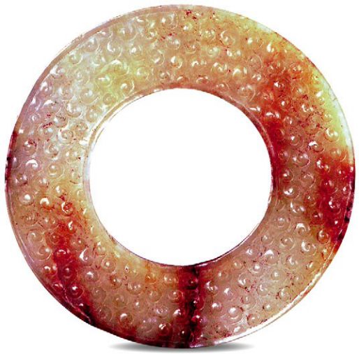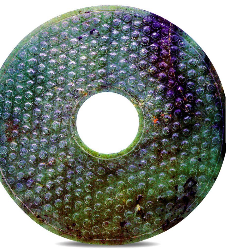 Ⅲ式:直径9.48厘米,孔径3.74厘米,厚0.4厘米。白玉质,体扁平圆形,局部有褐色沁,器表双面雕琢规整谷纹,有内外廓,外廓内沿分布12个小孔径圆穿。