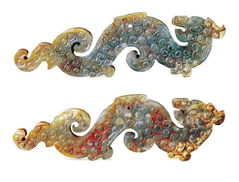 Ⅰ式:2件,长14.1厘米,宽4.18厘米,厚0.77厘米。大小、形构、纹饰雷同。青玉质,局部有黄色沁。体扁平片状,整器雕琢成卷曲龙形,龙首回望,口微张,厚唇,头顶部向后伸展一短角,角末端上翘。躯体向上弯曲隆起,腹部饰有三组卷曲羽翅,背部出脊,脊顶面较平,脊下一穿孔用于佩系。龙体两面满饰浅浮雕谷纹、勾连谷纹,一面粘有朱砂,有凸起的边廓。从器形、纹饰组图风格看应属战国器。
