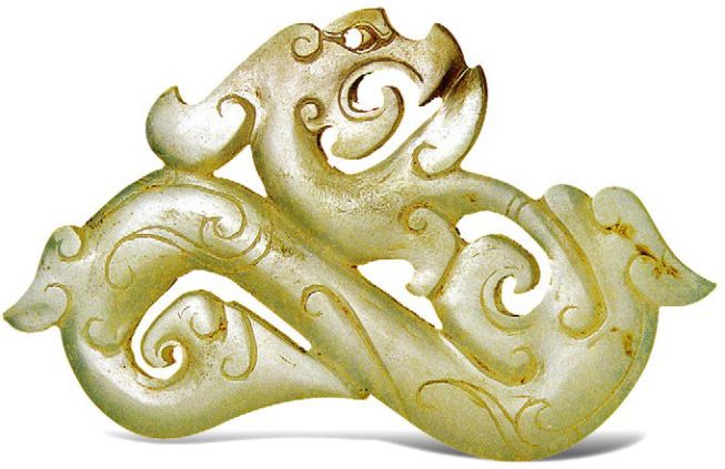 Ⅱ式:长6.9厘米,高3.84厘米, 厚0.24厘米。白玉质,头部有浅褐色土沁。体扁平,通体透雕成紧凑的龙形,龙首后仰,张口,上吻前突而末端膨大,下吻末端略向内卷,眼部有一圆穿,头顶向后一角微上翘,龙首、身、尾卷曲呈流畅严谨的“S”形,颈及尖尾伏贴于躯体上下部,躯体多处有短小变形羽翅,体表两面单阴线雕琢疏朗卷云纹、短平行线纹。整器构图奇巧、雕琢精细、动感十足。