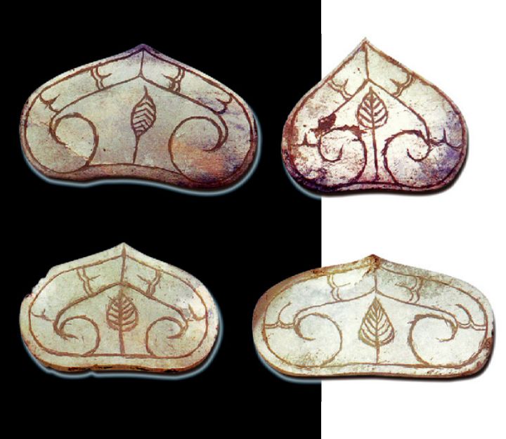 Ⅰ式:4件,青玉质,局部有黑色沁,器作心形,均沿器边缘刻一心形边框,器中部饰一草叶纹,两侧刻卷云纹间以花蕾纹。图案以草叶纹的茎为中轴线,形成左右对称的纹饰。纹饰均以浅细线刻划,铊具旋切不精,有“跳刀”痕。上左:长3.3厘米,宽1.9厘米;上右:长2.7厘米,宽2.3厘米;下左:长2.7 厘米,宽1.9厘米;下右:长3.4厘米,宽1.7厘米。