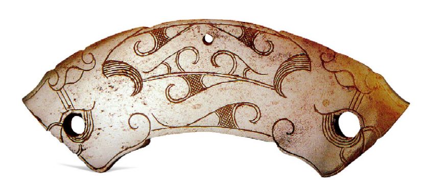 Ⅳ式:长9.6厘米,宽2.1 厘米,厚0.36厘米。白玉质,局部褐色沁。体扁平弧状,双首合体龙形,一端较宽,龙首上吻硕大,前端尖细略上翘,下吻窄小而末端尖细,微张口,阴线刻椭圆眼出梢,下颌各有一穿。龙身密布规则的细阴刻线几何菱形纹,背部两脊突出,有两穿。两面纹饰相同。战国至西汉时期,器表雕琢线刻纹的双首合体龙形璜较多,与本式璜形构、纹饰雷同者罕见。