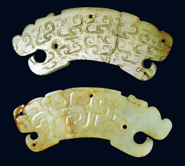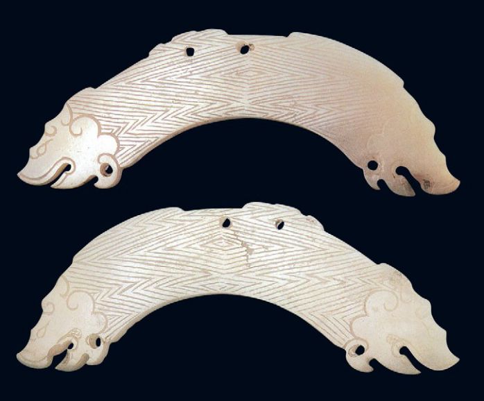 Ⅱ式:长8.4厘米,宽2.5 厘米,厚0.4厘米。白玉,局部褐色沁,体扁平短弧形。双面雕,两面纹饰相同,两端细阴线雕琢出龙首纹, 龙首上吻略上翘,龙口有圆穿,椭圆眼两侧出梢,角向后附于背缘部,角下方以细阴线刻划出一束末端尖细的弧形绺毛。躯体填饰不规则几何形细阴线网纹、卷云纹等,线条生动流畅,但雕琢不甚精细,显微观察有“崩缺”、“跳刀”痕。弧背正中近缘部有一小圆穿。从纹饰雕琢风格特征看属战国器。战国常见阴线刻组图的双首合体龙形璜,但与此器纹饰雷同者不多。