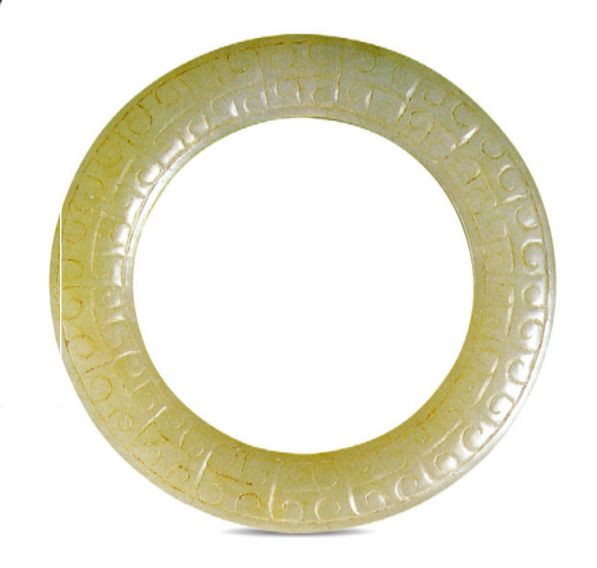 白玉质,缘部有褐色沁,体扁平,内缘部厚,向外缘渐薄,两侧外缘出脊牙,内、外有廓,廓内双面雕琢规整谷纹。外缘侧壁处刻划有“上十二”铭文。“璇玑”一词源出于《尚书·舜典》:“在璇玑玉衡,以齐七政。”孔安国:“在,察也,璇,美玉也;玑衡,王者正天文之器,可运转者。”可见玉璇玑是古代观测天象的一种玉雕仪器,其渊源可追溯至史前时期。也有研究者认为此类器仅系边缘雕琢有装饰性扉牙的环,与观测天象的天文仪器无关。