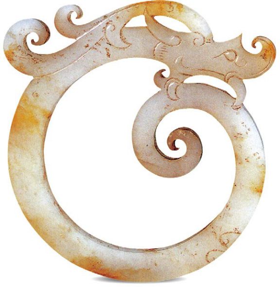 Ⅲ式:最大径5.53厘米,孔径3.5厘米, 厚0.4厘米。白玉质,局部有黄褐色沁斑。整器雕琢成首尾连接的环状,龙嘴夸张性大张,露出前后两颗尖细獠牙咬嵌入尾部,上吻硕大,前端尖细卷曲,下吻窄小而向外翻卷,水滴形眼,头顶部向上呈三角状凸起,短角后扬上翘,至末端渐窄细,角前方雕琢粗长而向后飘卷,末端分岔的鬃毛,龙首部五官轮廓、面颊须毛以简练细阴线勾勒,龙体由前端至尾部呈圆弧形内收卷曲,两面饰以少量的细阴线卷云纹,末端尖细。