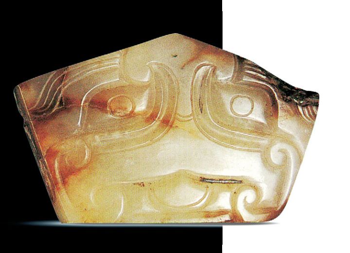 Ⅱ式:1件,长4.2厘米,宽3.64厘米,厚0.74厘米。青玉质,局部有黄褐色沁, 器作尖首梯形。单面雕琢兽面纹,大眼眶凸目,单阴线圆圈表示眼珠,如意鼻、卷云纹兽耳,背部砣出人字形凹槽。左下角略残。