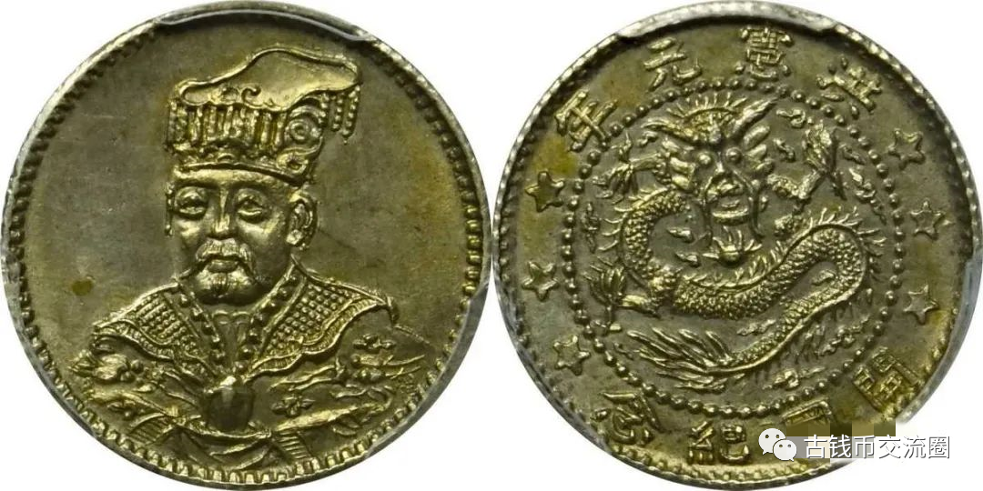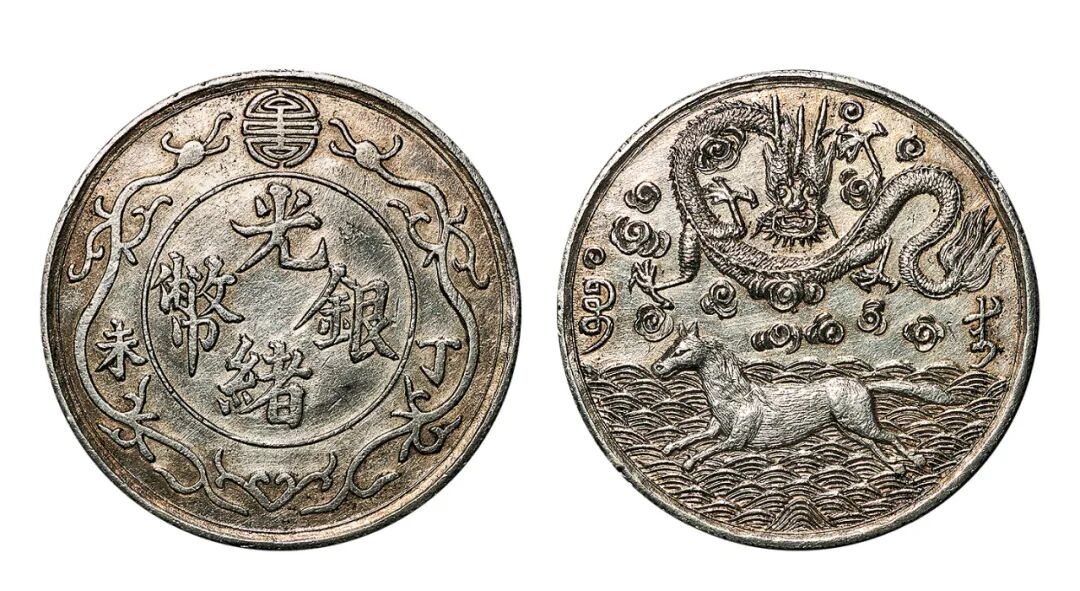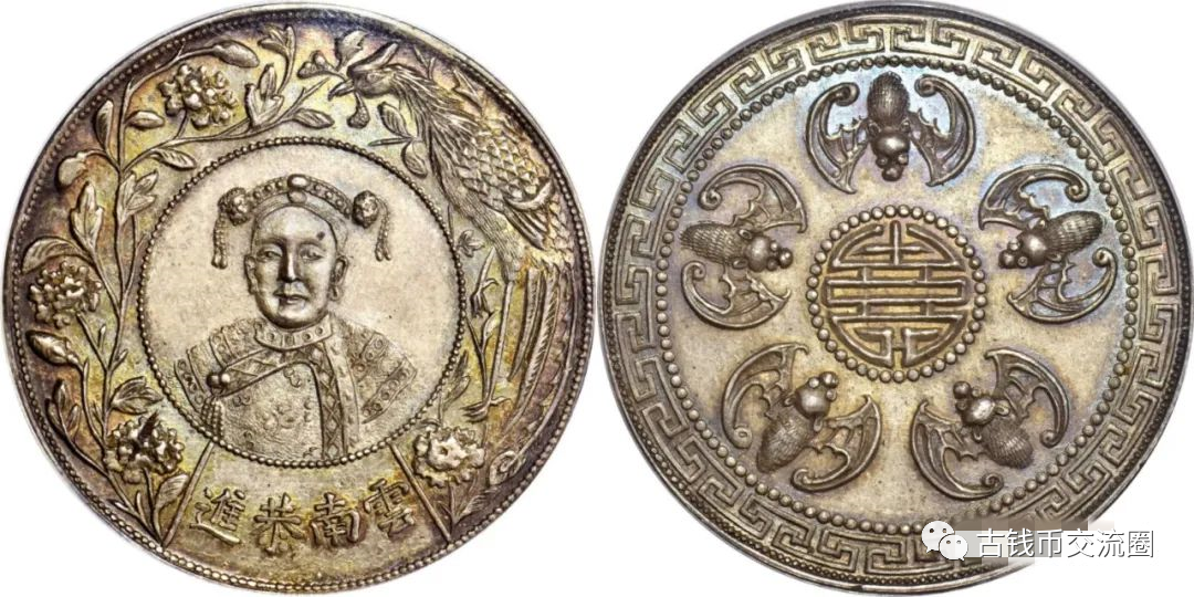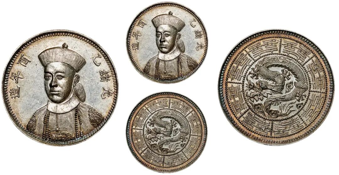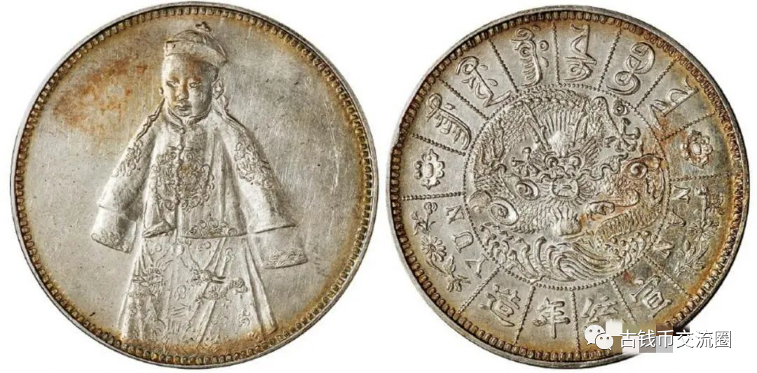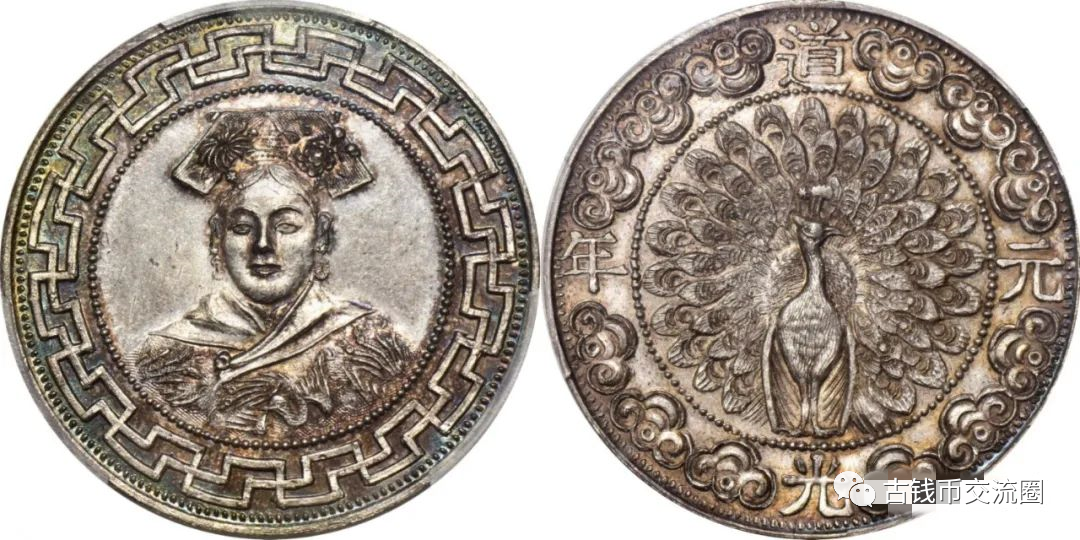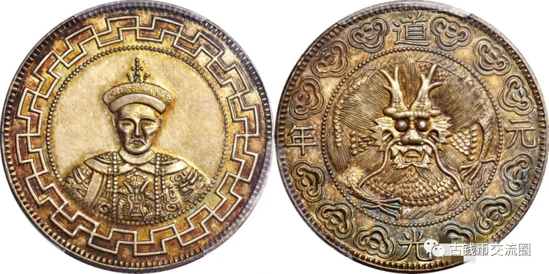 20世纪初,民国时期,在北京、天津、上海等一些大城市,币商或者一些银楼,悄悄仿着银币真品翻版私造;有人为了追求出谱猎奇,有的还为了填补空白,私自设计臆制当时的“假银元”;内容题材丰富比如有道光皇帝、皇后像银币、道光寿星异品银币、同治皇帝像恭进银币、光绪“乙酉”载活、慈禧像银币光绪、慈禧像恭进银币、四川省造光绪、慈禧像银币、光绪皇帝遗像银币、宣统皇帝登基像银币、“洪宪”帝装像银币、“洪宪纪元”飞龙银币张勋像“复辟纪念”银币等等;(其实主要是名家旧藏带来的价值)正面道光帝正面像,外圈为交织的几何图案;反面中央龙面朝前,边缘花饰汉字铭文"道光元年";品相一流,两面边缘均有包浆,PCGS MS 64;SBP2021年香港拍卖中,以36000美元成交,折合人民币约23万;正面皇后像外有几何纹交织环绕,反面孔雀开屏,边缘花饰铭文"道光元年"。近原厂状态,底板闪烁光辉,两面边缘均有多彩包浆,PCGS MS65,与上一枚道光银币完美配对;SBP2021年香港拍卖中,以33600美元成交,折合人民币约21万;宣统年造宣统皇帝像背云南水龙图臆造银币(1909)