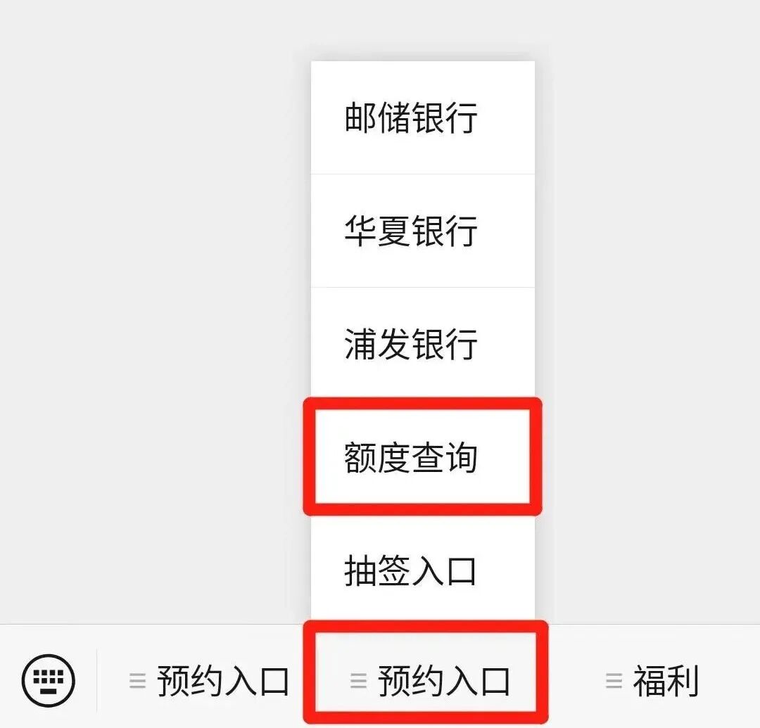 第二步:进入公众号,点击菜单栏中间的“预约入口--额度查询"即可进入查询各网点额度。
