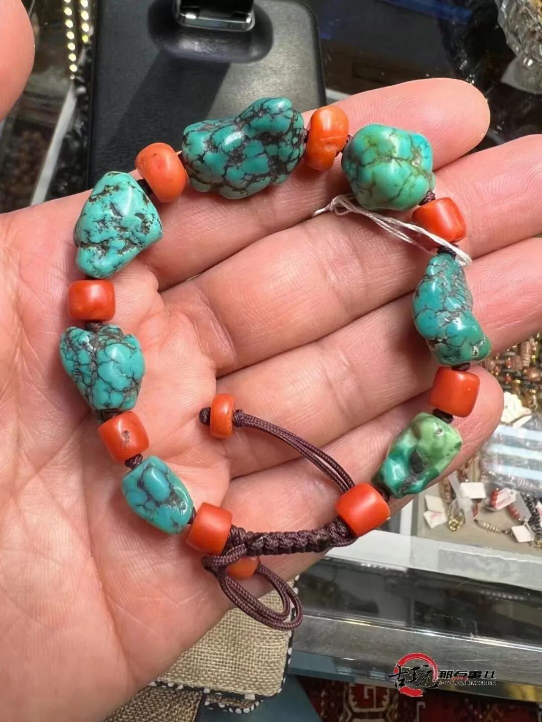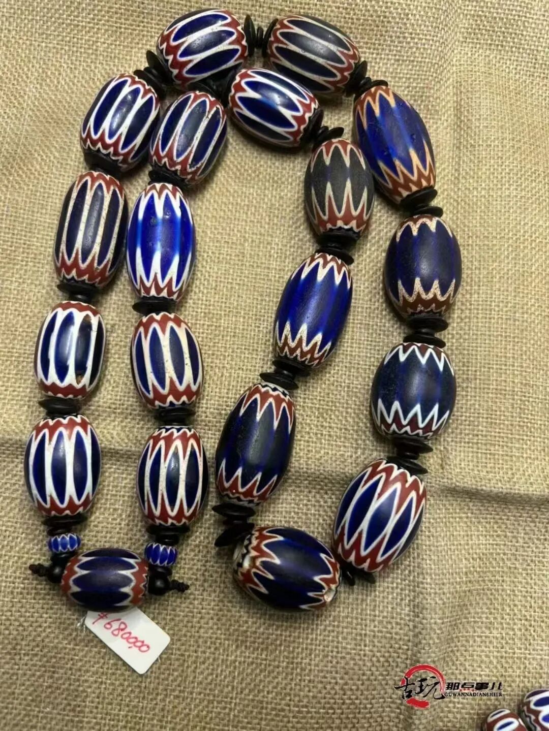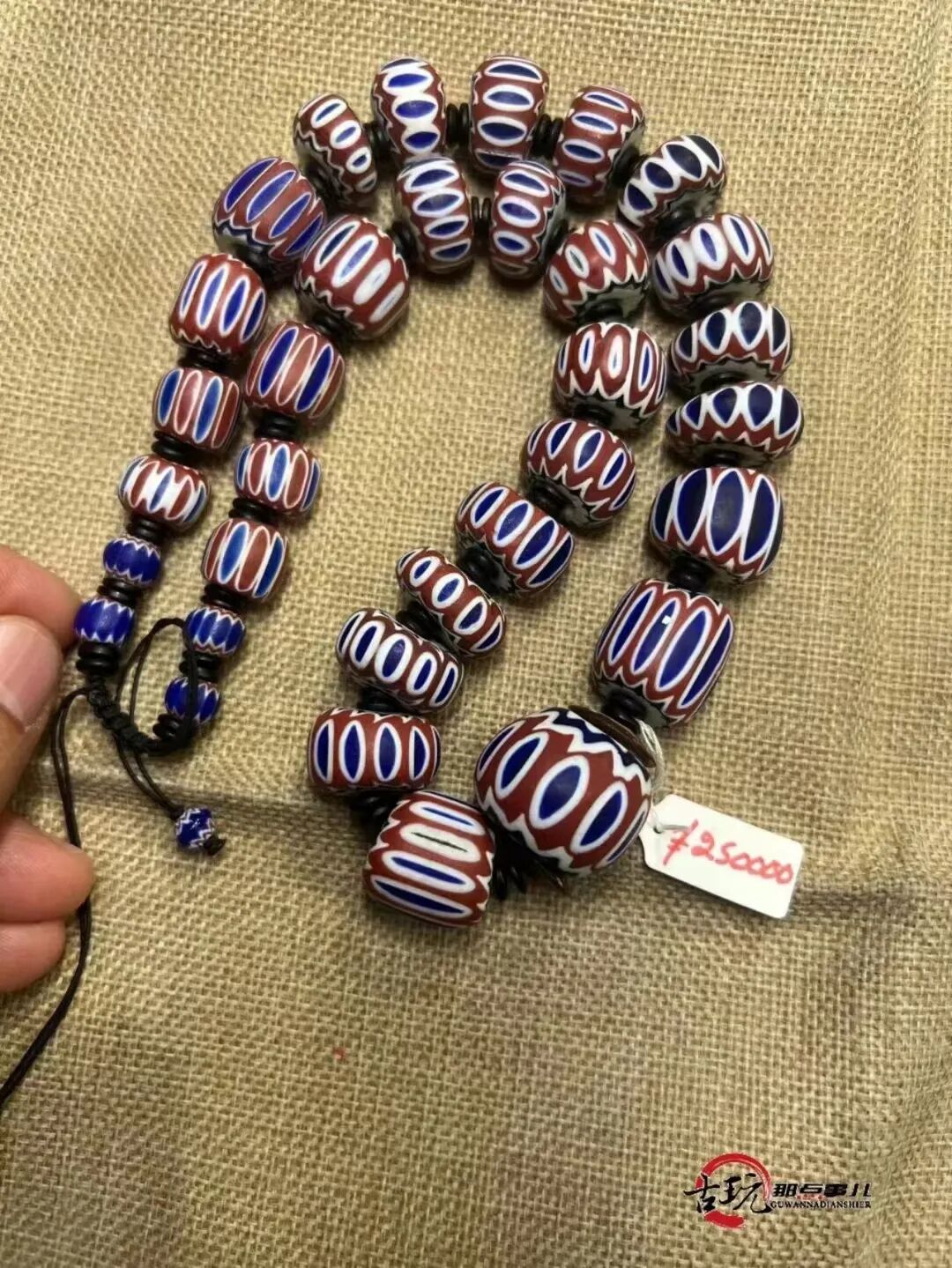主珠左右两侧各有一颗琉璃珠,年代较红石髓珠晚。此珠串由各式红石髓珠相连而成,珠子造型各异,染色纹饰有眼纹、横纹、网格纹等,极为珍罕。