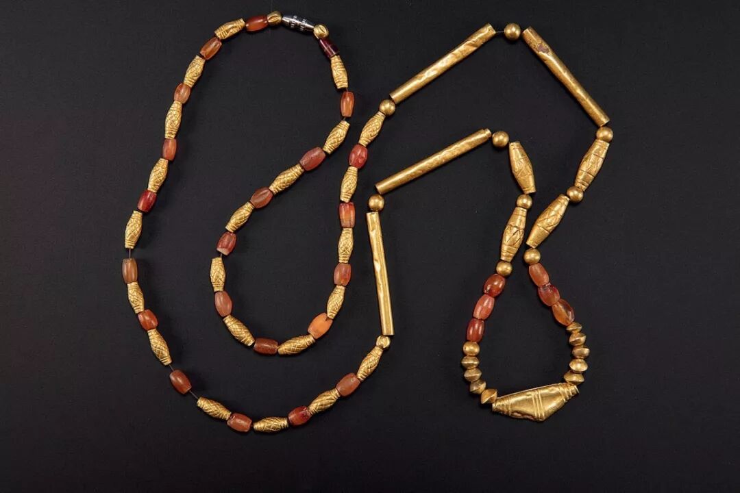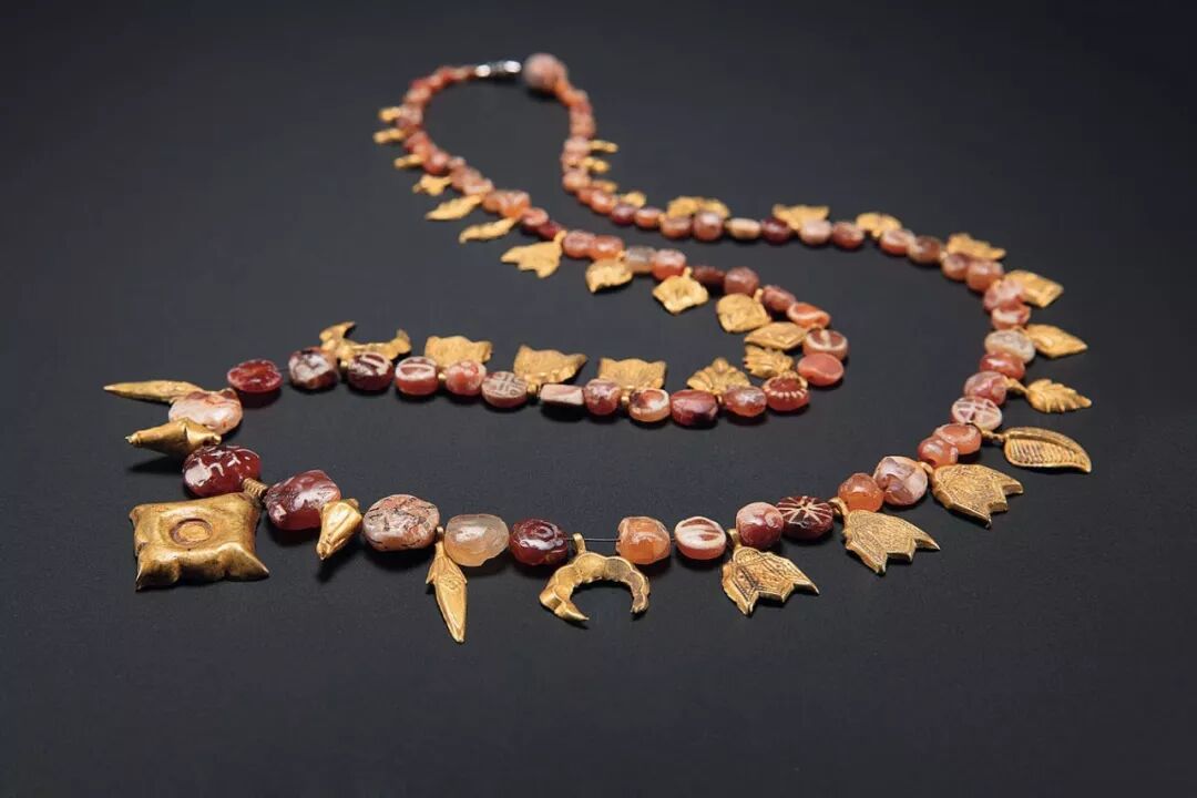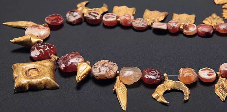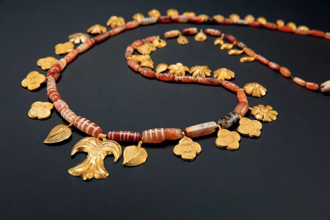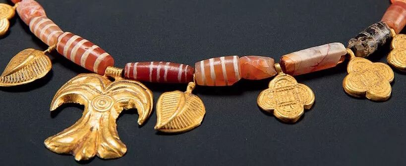 此项链以蚀花肉红石髓珠配各式金花,金花形态各异,装饰性极强,蚀花肉红石髓珠应源于印度河河谷地区,此二者相搭配,缤纷绚丽,应为重要人士所佩戴。其金花的样式带有极为强烈的亚述风格,玫瑰花形金花与同时期亚述宫殿浮雕中皇族及守护者所佩戴的珠宝纹饰极为相似。石雕纹饰应该来源于生活,而金饰则是皇室与王族生活的最佳写照。