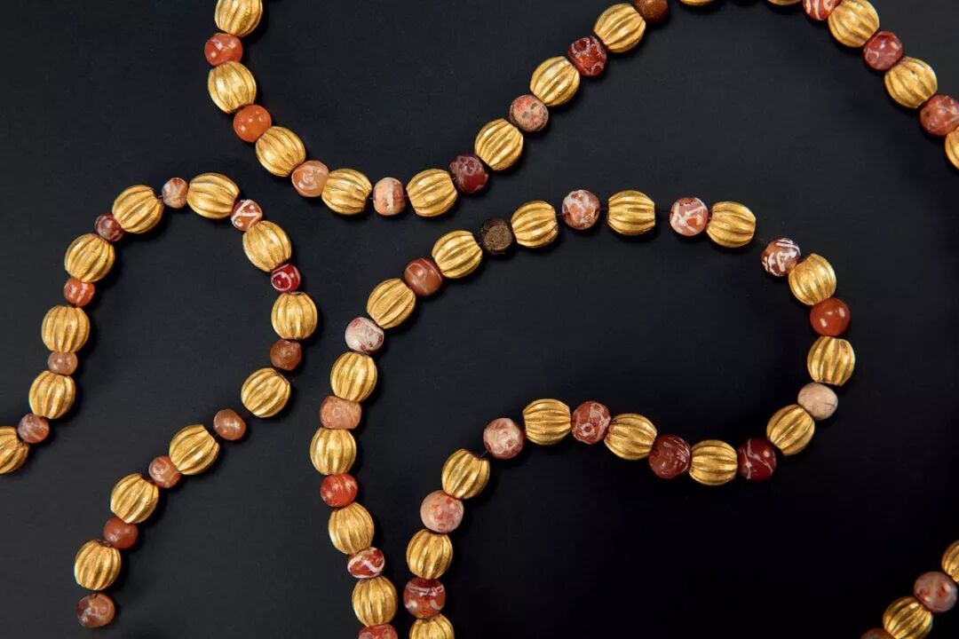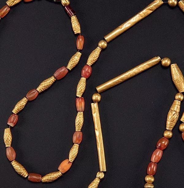 这条肉红石髓珠配长金管项链的年代为古代肉红石髓珠使用中期,即公元前30 年至公元200 年,搭配附有地中海风格的锥形吊坠,管形、圆形、陀螺型金珠,应属于地中海地区公元1-3世纪。由此也可以看到早期苏美尔金饰对于整个希腊罗马地区艺术风格的影响。