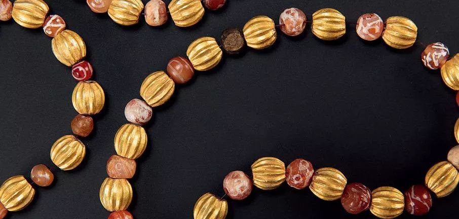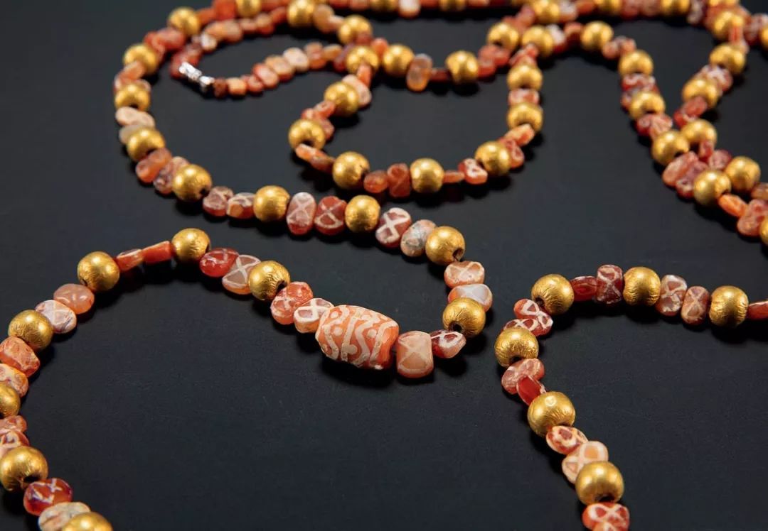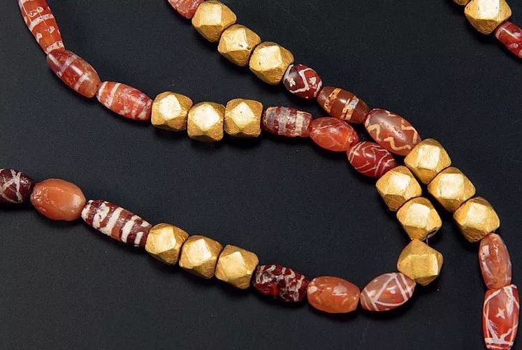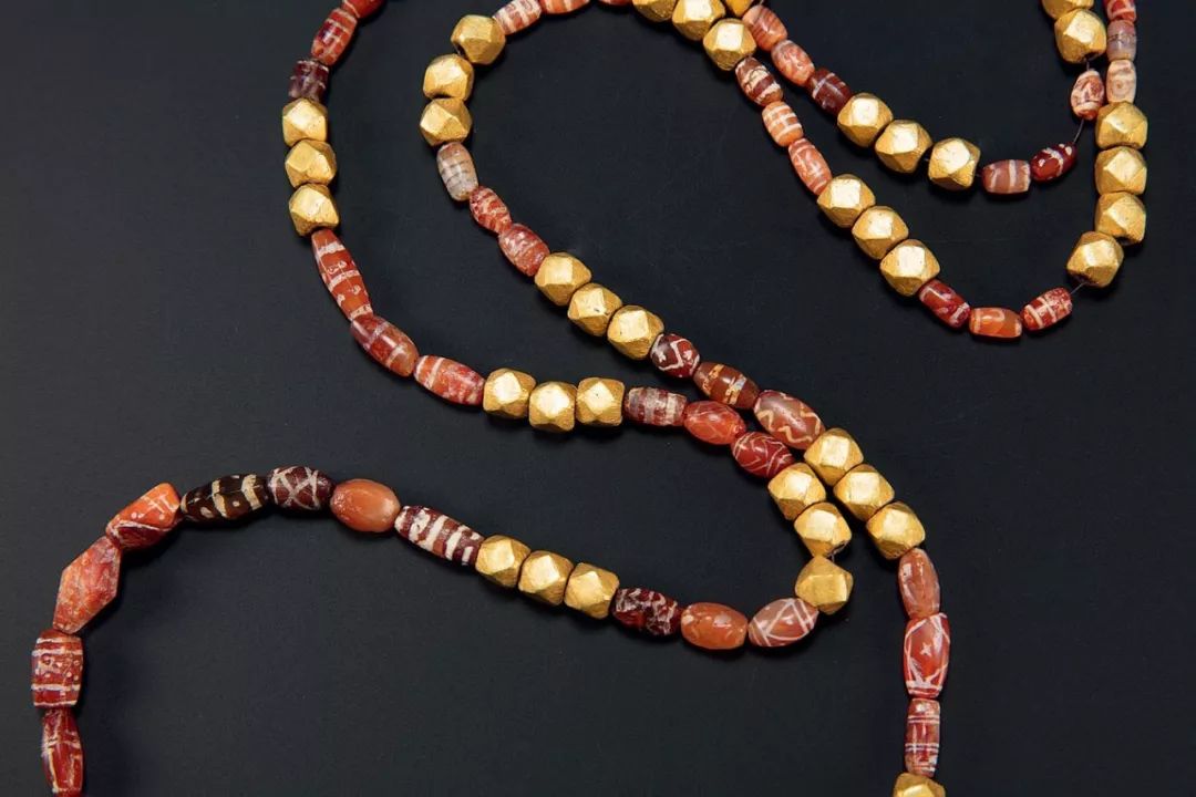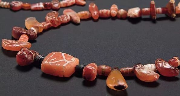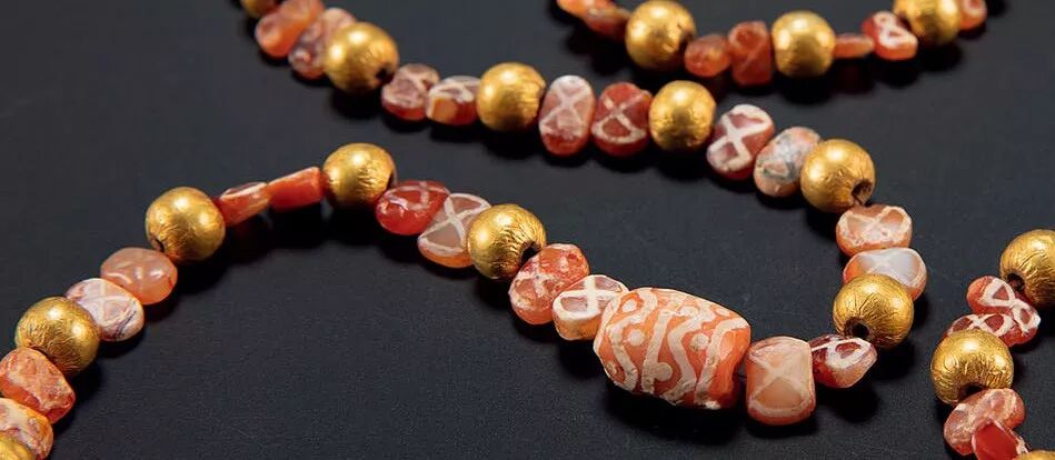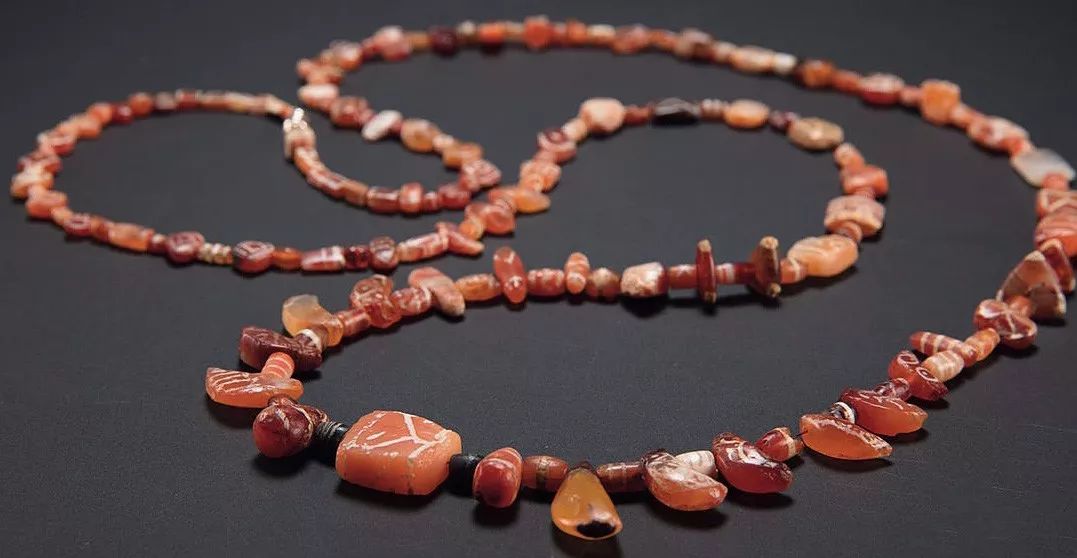 “蚀花肉红石髓珠”,公元前3000 年起源于印度河流域古文明,而且很早就传入美索不达米亚和古埃及。