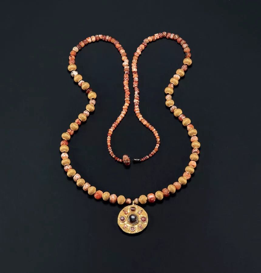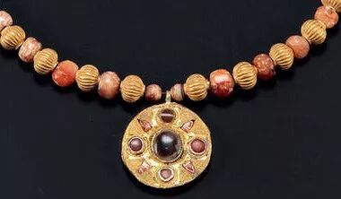 公元前8-7世纪 蚀花肉红石髓珠配圆形金吊坠大钱纹金珠项链