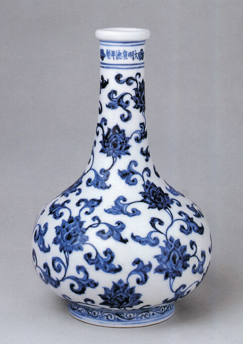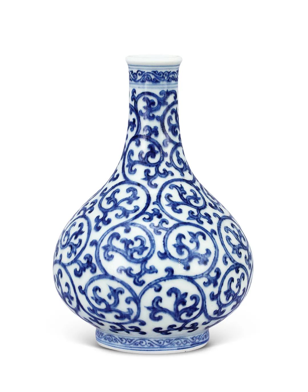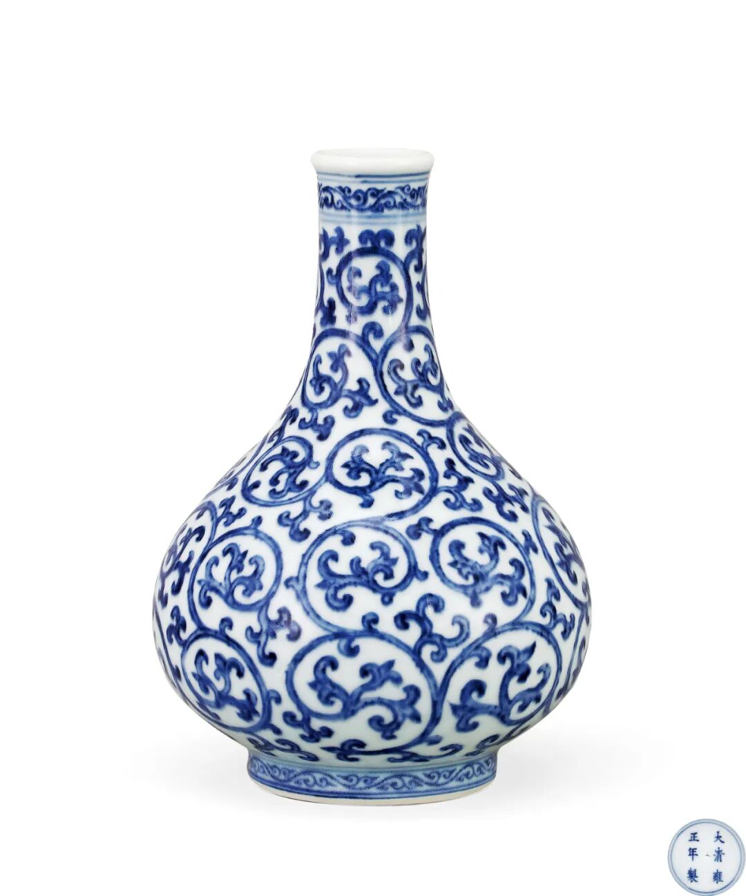 本品唇口,直颈,扁圆腹,圈足。釉色白中泛微青,瓶身以青花绘满卷草文。底心书青花“大清雍正年制”楷书款。瓷瓶纹饰在雍正朝青花官窑器中属于罕见,底款写法亦不同与其他雍正朝作品,疑为雍正一朝早期,安窑慕古创烧之作品。此瓶底部胎质细腻,青花发色及绘画为雍正时期典型特征。其纹饰灵感原型应当来源于宣德青花器,可见藏于英国大维德基金会“雍正六年古玩图轴(卷六)”中,宝座右侧第一件即为一例宣德卷草纹瓶,主题纹饰、器型与本品如出一辙,为典型雍正皇帝慕古之作。于“古玩图”轴中,其本品原型之宣德青花卷草瓶被绘制在宝座一旁最近的地方,可见此类瓶为深得雍正皇帝喜爱的佳器,并命御窑厂对照宣德实物仿制而成。故此推断,本品为依照宣德青花卷草瓶原样等比例仿制而成,其造型比例、青花的晕散均与其母本神似,而细观其胎釉、青花呈色等细微之处又呈现出典型的十八世纪早期景德镇青花瓷器的时代风格,实为一件雍正时期摹仿宣德青花的经典作品,工艺精湛。