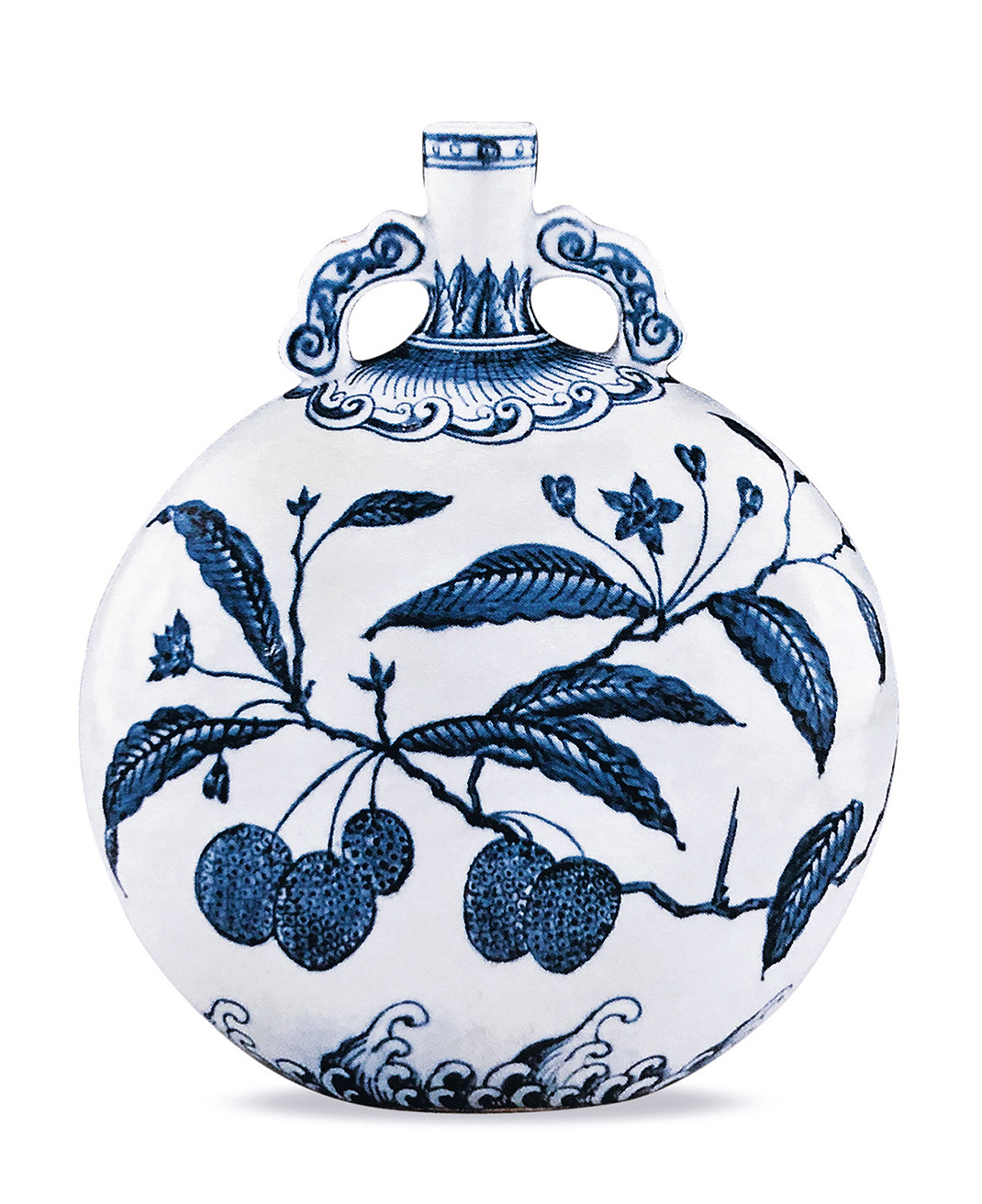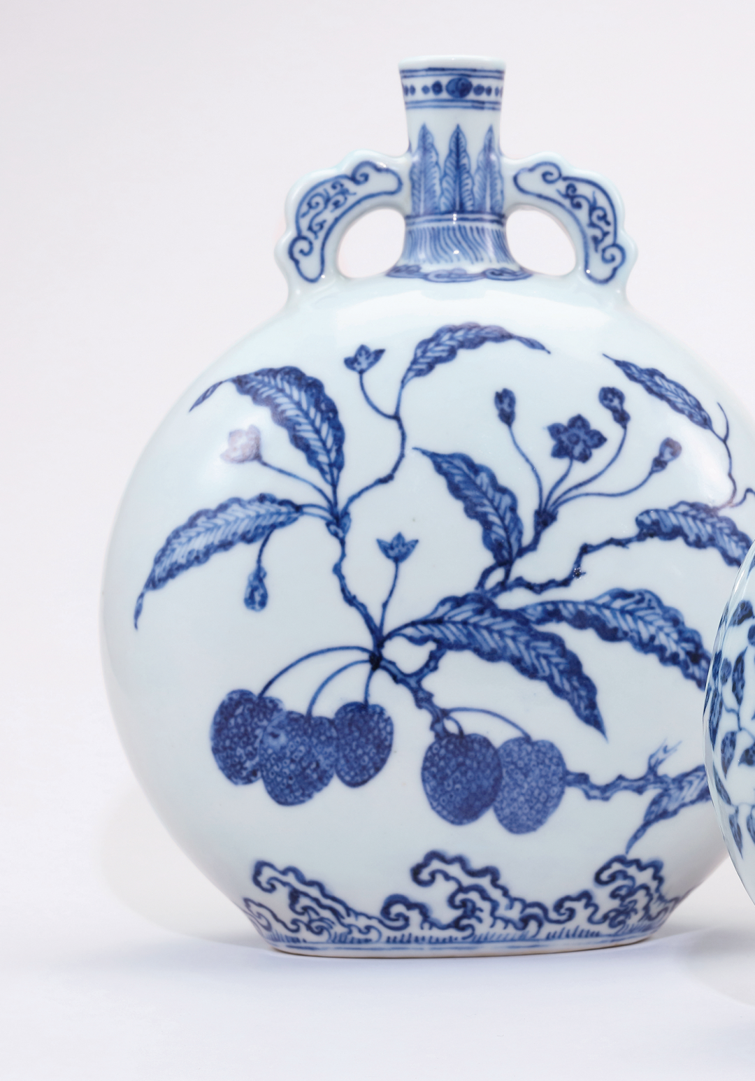 本品为雍正御窑摹古永乐青花之卓越代表,永乐朝例可参见大英博物馆典藏青花荔枝图抱月瓶,著录于《Ming Ceramics》,J.Harrison Hall,页109,编号3:20;另可见一永乐例,原为日本住友集团旧藏,后捐赠于大阪东洋市立陶瓷美术馆,著录于《东洋陶瓷的展开》,大阪市立东洋陶瓷美术馆,1999年,图版43。雍正皇帝曾不止一次遣送清宫所藏古董瓷珍至景德镇以资效仿,雍正皇帝事无巨细,本朝摹古瓷器与原型几难分辨,大阪东洋市立陶瓷美术馆藏品与本品尺寸、器型、纹饰构图、青花发色如出一辙,极可能为本品祖本。翻检各方典藏资料,见一例售于香港苏富比,1982年5月18日,编号144。另亦有一件同类收藏,为法国皇后欧珍妮.德.蒙提荷宝蓄,此后入藏于法国考古学家Joseph Henry Barbet de Jouy 收藏,期后由家族传承。直至2011年于拍卖场上释出,佳士得香港,2011年6月1日,编号3569。多次见于拍卖场,最后一次售于我司2021年4月21日,编号3211。其他类似参考,见北京故宫博物院所藏【清雍正青花折枝花果纹双耳扁背壶】,录于《清代御窑瓷器.卷一下》,紫禁城出版社,2005年,页396-397;【清雍正青花花鸟纹双耳扁壶】,同前书出处,页106-107。此器来源有序,尤为难得。早年为 Jacobs Demarest旧居收藏宝蓄,经纽约苏富比释出,此后入藏于Marlene Casey,期后由张宗宪先生递藏。直至2000至2005先后于拍卖场上释出,最终由北美十面灵璧山居主人宝藏。