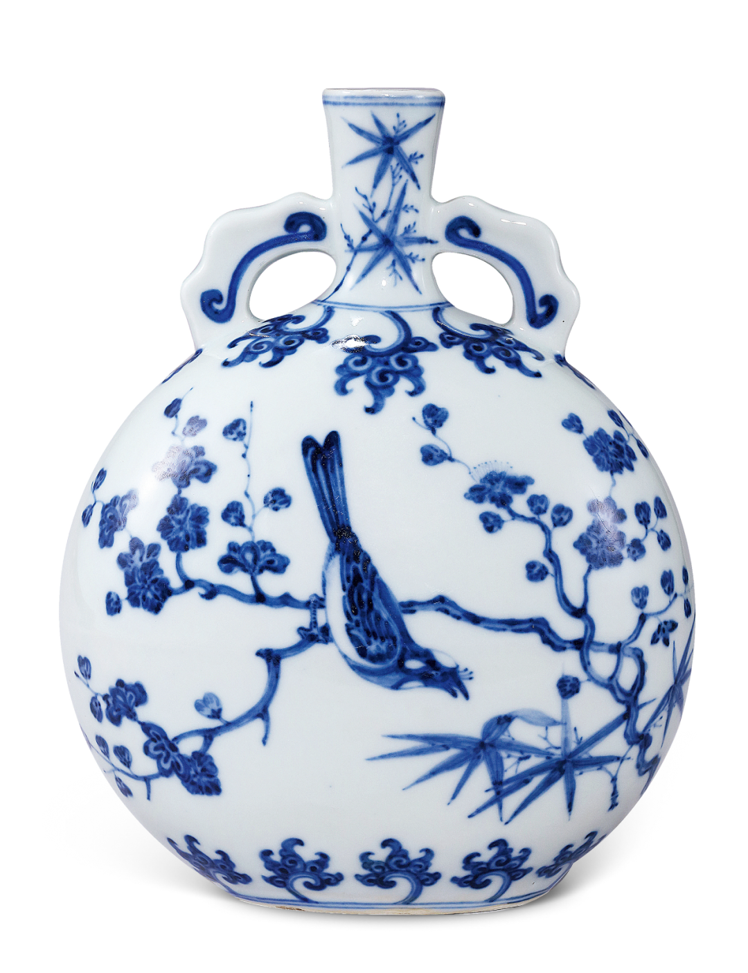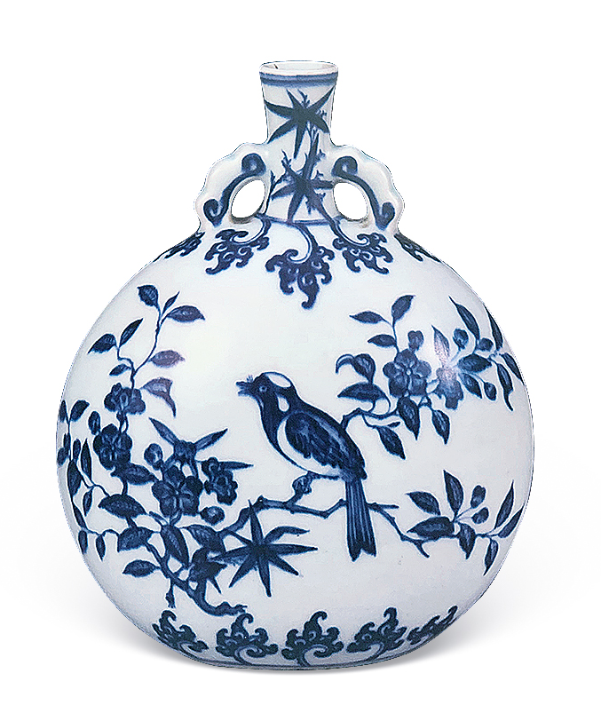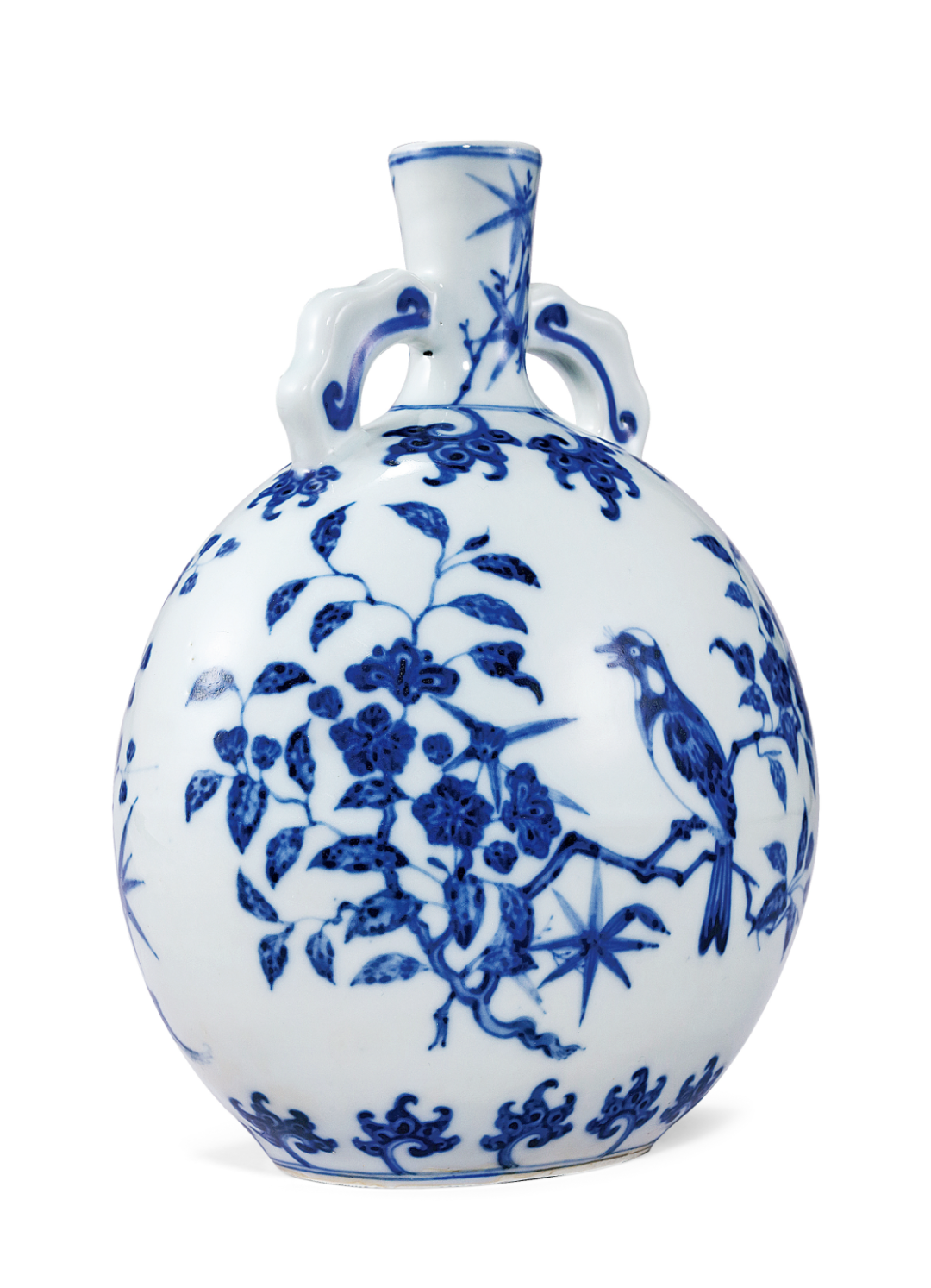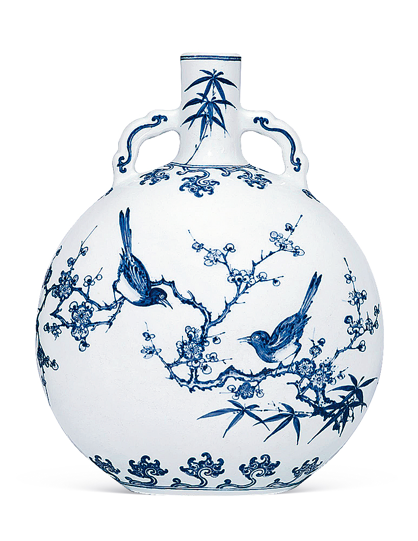本器为清雍正仿明永宣青花瓷,造型源自阿拉伯铜器。壶小圆口,直颈,扁圆形腹,椭圆形底无足,平砂底无釉,肩部饰对称的如意形双耳,许之衡称为「口际飘双带」,使作品于整体视觉效果上达到均衡虚实之美。通体以青花装饰,颈部绘青花翠竹,肩部及胫部绘变形花卉,腹部两面绘折枝花鸟图,分别绘喜鹊伫立于梅枝、桃茎之上,姿态各异,青花淡雅略有晕散。底部亦饰云肩纹,笔法简洁洗练,细腻流畅。通体釉质莹洁温润,色泽沉稳高雅。无论在器形、纹饰风格上均为仿明永乐式样,是雍正仿永乐青花瓷器的佳作。存世的永乐原型有两件,尺寸较大(30公分高),一藏台北故宫博物院,著录于《故宫藏瓷 — 明青花瓷(一).洪武永乐》香港,1963年,图版9、9a;另一藏伦敦大维德基金会(30.8公分高),现展于大英博物馆,载于苏玫瑰著《Elegant Form and Harmonious Decoration:Four Dynasties of Jingdezhen Porcelain》伦敦,1992年,图版29。目前仅知另外一件与原型尺寸相同的例子,藏于荷兰吕戈登国立公主陶瓷博物馆,著录于D. Lion-Goldschmidt著《Ming Porcelain [明代瓷器]》,弗里堡,1978年,页47,图版13,书中作者对其明代定年存疑,馆方现今亦将之定年为雍正。尚知一件雍正无款例子,尺寸接近永乐原型,先后为Richard de la Mare、苏林庵及玫茵堂收藏,著录于康蕊君,《玫茵堂中国陶瓷》,伦敦,1994-2010年,卷4,编号1712,后于香港苏富比,2011年4月7日,拍品76(30.5公分高)。及见一例藏于台北故宫博物院,著录于《适于心 — 明代永乐皇帝的瓷器》,台北,2017年,页158(29.9公分高)。如本品般小尺寸之例,见清宫旧藏(22.4公分高),录于《故宫博物院藏清雍正青花瓷器》,故宫博物院,编号123;乐山堂收藏(22.3公分高),展览及出版于《乐山堂藏瓷》,台北,2005年,图版29,后售于香港苏富比,1997年11月5日,编号1371;再售于香港佳士得,2015年6月30日,编号3126。另知近似的雍正青花花鸟图抱月瓶二例,尺寸较大(36.5公分高),腹一面绘喜鹊登梅,另面绘枇杷绶带鸟,一件底磨款,曾为张宗宪先生旧藏,后著录于《庄绍绥中国瓷器收藏》,香港,2009年,图版34;另一件底书雍正六字篆书款,藏于故宫博物院,载于《故宫博物院藏文物珍品大系—青花釉里红(下)》,2010年,页111,图版97。另外亦见一伦敦私人收藏,售于香港佳士得,2016年11月30日,编号3309。香港佳士得,2016年月11月30日,编号3309