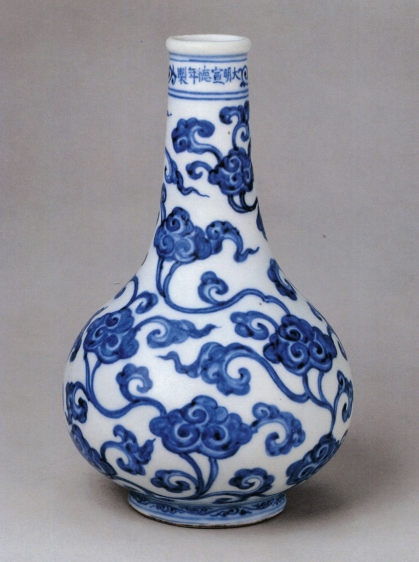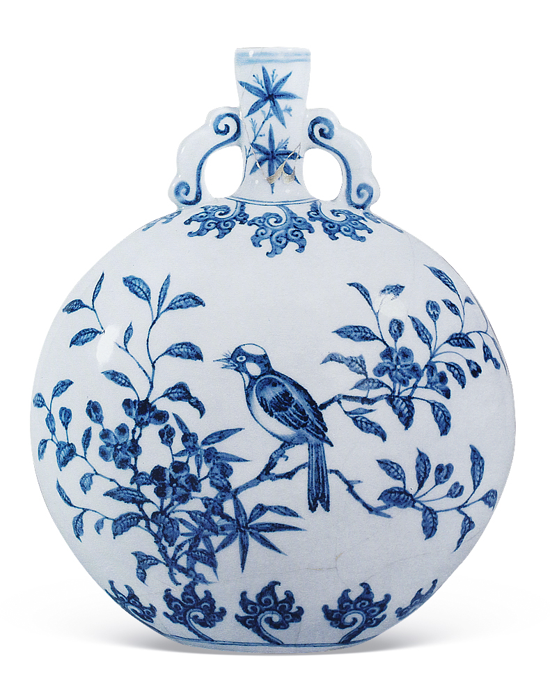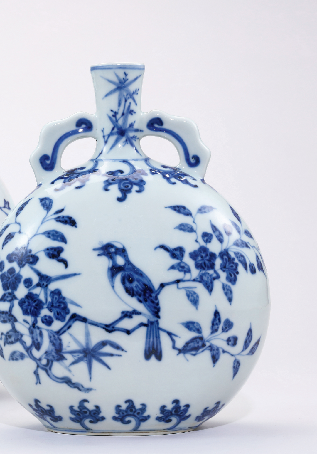 本器为清雍正仿明永宣青花瓷,造型源自阿拉伯铜器。壶小圆口,直颈,扁圆形腹,椭圆形底无足,平砂底无釉,肩部饰对称的如意形双耳,许之衡称为「口际飘双带」,使作品于整体视觉效果上达到均衡虚实之美。通体以青花装饰,颈部绘青花翠竹,肩部及胫部绘变形花卉,腹部两面绘折枝花鸟图,分别绘喜鹊伫立于梅枝、桃茎之上,姿态各异,青花淡雅略有晕散。底部亦饰云肩纹,笔法简洁洗练,细腻流畅。通体釉质莹洁温润,色泽沉稳高雅。无论在器形、纹饰风格上均为仿明永乐式样,是雍正仿永乐青花瓷器的佳作。存世的永乐原型有两件,尺寸较大(30公分高),一藏台北故宫博物院,著录于《故宫藏瓷 — 明青花瓷(一).洪武永乐》香港,1963年,图版9、9a;另一藏伦敦大维德基金会(30.8公分高),现展于大英博物馆,载于苏玫瑰著《Elegant Form and Harmonious Decoration:Four Dynasties of Jingdezhen Porcelain》伦敦,1992年,图版29。目前仅知另外一件与原型尺寸相同的例子,藏于荷兰吕戈登国立公主陶瓷博物馆,著录于D. Lion-Goldschmidt著《Ming Porcelain [明代瓷器]》,弗里堡,1978年,页47,图版13,书中作者对其明代定年存疑,馆方现今亦将之定年为雍正。尚知一件雍正无款例子,尺寸接近永乐原型,先后为Richard de la Mare、苏林庵及玫茵堂收藏,著录于康蕊君,《玫茵堂中国陶瓷》,伦敦,1994-2010年,卷4,编号1712,后于香港苏富比,2011年4月7日,拍品76(30.5公分高)。及见一例藏于台北故宫博物院,著录于《适于心 — 明代永乐皇帝的瓷器》,台北,2017年,页158(29.9公分高)。如本品般小尺寸之例,见清宫旧藏(22.4公分高),录于《故宫博物院藏清雍正青花瓷器》,故宫博物院,编号123;乐山堂收藏(22.3公分高),展览及出版于《乐山堂藏瓷》,台北,2005年,图版29,后售于香港苏富比,1997年11月5日,编号1371;再售于香港佳士得,2015年6月30日,编号3126。另知近似的雍正青花花鸟图抱月瓶二例,尺寸较大(36.5公分高),腹一面绘喜鹊登梅,另面绘枇杷绶带鸟,一件底磨款,曾为张宗宪先生旧藏,后著录于《庄绍绥中国瓷器收藏》,香港,2009年,图版34;另一件底书雍正六字篆书款,藏于故宫博物院,载于《故宫博物院藏文物珍品大系—青花釉里红(下)》,2010年,页111,图版97。另外亦见一伦敦私人收藏,售于香港佳士得,2016年11月30日,编号3309。香港佳士得,2016年月11月30日,编号3309