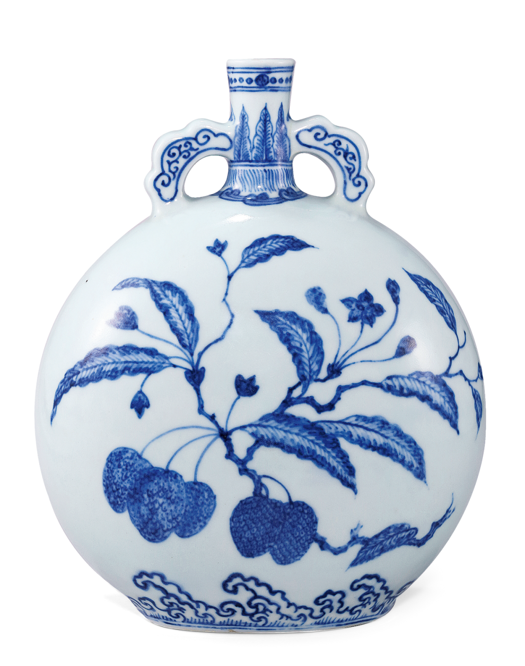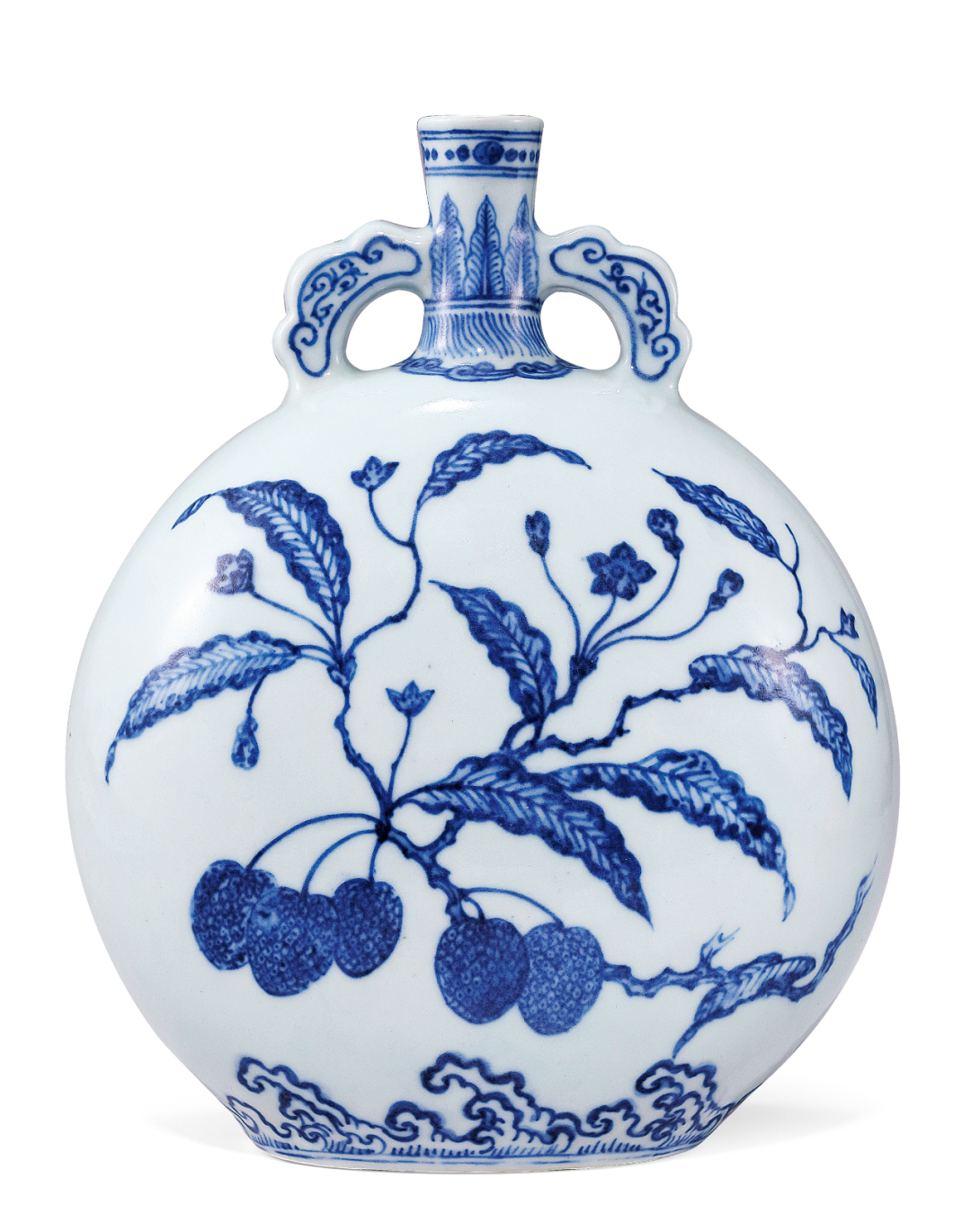 本瓶器型端庄隽秀,壶细口,直颈,扁圆形腹,椭圆形圈足,平砂底无釉,釉汁匀净淡雅,细腻莹润。肩部饰对称的如意形双耳,许之衡称为「口际飘双带」。口沿青花花纹装饰,颈饰蕉叶纹,肩与底部皆绘海水纹,主题纹饰的折枝荔枝亦是以永窑为范,谐音「利吉」。本品为雍正御窑摹古永乐青花之卓越代表,其所摹之祖本可参见大英博物馆典藏永乐青花荔枝图扁壶,著录于《Ming Ceramics》,J. Harrison Hall,页109,编号3:20。比较二者,本品仿永乐苏麻离青料所绘青花点染;近底处海水波浪纹饰画法;荔枝枝干勾勒,无一不忠于原型,本器施釉肥厚,白中泛青,为典型雍正官窑仿永乐青花之佳作。永宣御窑品格之美,为有明一代之冠,其中青花一门,极负盛名,终明之世,精光不泯,影响波及数百年。永宣时期青花采用进口“苏麻离青”料,青花发色浓郁深沉,笔画起承转合处,釉料浓厚,入窑之后呈黑蓝色星星点点,非但不暗沉,更显油亮,被称为“铁锈斑”。永宣青花瓷器纹饰布局疏朗清新,勾绘舒展流畅,静雅可赏,加之以“苏麻离青”料勾勒,宛若一幅水墨画跃然瓶上。雍正皇帝雅好古物,品味颇高,宫廷制器有“仿旧须宗雅则,肇新亦有渊源”之原则,仿古采今,蔚为大观,永宣制器苍妍雄浑之品格最得胤禛之青睐。雍正青花选料精细,工艺严格,「参古今之式,汇以新意,备储巧妙」,成就非凡,有「明看成化,清看雍正」之说。永宣青花的「苍妍雄浑」之品格最得雍正青睐,此器着意不落款,令人极难分辨,是媲美前代之佳作。![]()