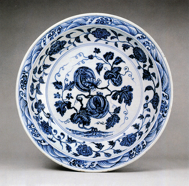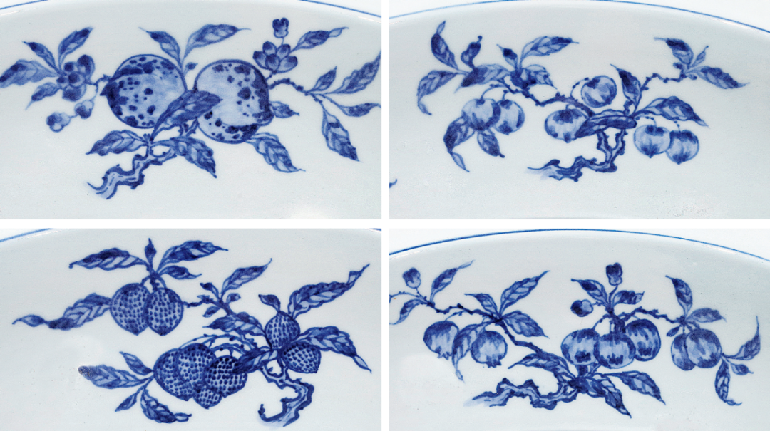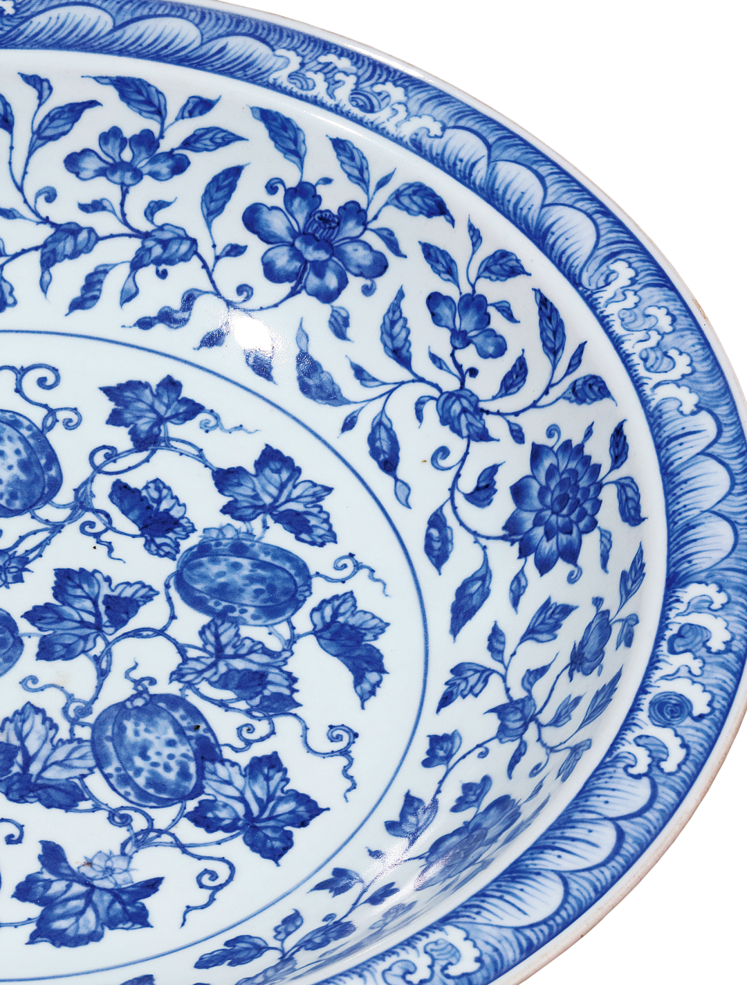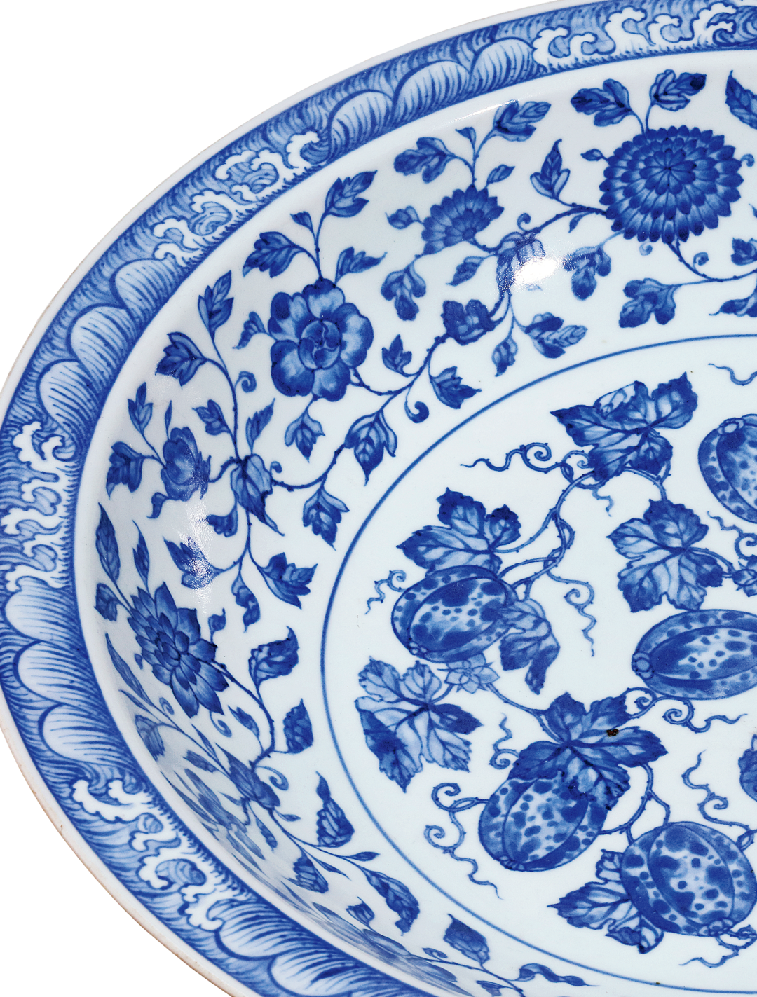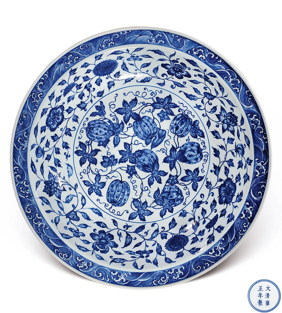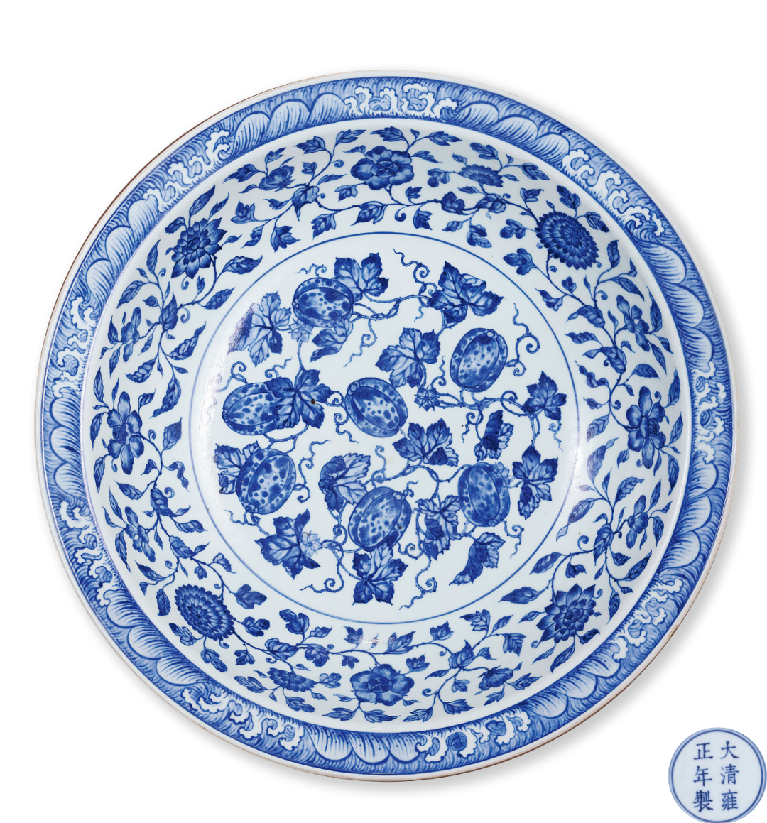 本品折沿,浅弧腹,下承圈足,体量颇丰,造型规整,胎质洁白细腻。内外壁以青花为饰,外壁饰绘折枝瑞果六组,内壁口沿上环绕一周海水纹,内绘缠枝四季花卉纹,寓意「四时报喜」。盘心绘缠枝瓜藤图,瓜果丰硕,枝叶招展,蔓藤缠绕,繁密而不凌乱,工整又不失灵动,寓意「瓜瓞连绵」。外底心青花双圈内书「大清雍正年制」六字双行楷书款。瓜,寓意忠心,其源可溯至秦朝东陵侯邵平。秦亡汉替后,邵平虽遭削爵抄家,却不趋附新政,出走长安,务农种瓜,瓜美,世称东陵瓜。陶渊明(354-427年)赋诗咏其忠心,由闵福德、刘绍铭收录于《含英咀华》,上卷:远古时代至唐代,香港,2000年,页502。后世素以瓜瓞为瑞果,祝颂子孙昌盛,不绝不断,成语谓之「瓜瓞绵绵」。雍正时期,唐英参考明瓷佳器,依明代图样又添新颖纹饰,承袭之余更青出于蓝。此盘重开明初之制,纹饰似曾相识,乃见于永乐青花盘,二瓜一瓞,同藤绵延,根茎没地,凹壁绘缠枝花卉,口沿饰水波纹,可比较天民楼藏例,录于《天民楼青花瓷特展》,鸿禧美术馆,台北,1992年,编号25,另见珠山御窑堆积出土一例,刊于《景德镇出土元明官窑瓷器》,北京,1999年,图版70。永乐之后,瓜瓞纹饰日渐式微,虽见盌、盘之类仍有采用,然构图有别,如一宫盌,成化年款,饰折枝瓜瓞三株,载于康蕊君,《玫茵堂中国陶瓷》,伦敦,1994年,卷2,编号677。另有一嘉靖盘,通体主饰「瓜瓞绵绵」纹,见台北故宫博物院展览图录《蓝白辉映:院藏明代青花瓷展》,台北,2016年,编号98。同品种藏品参见北京故宫,《故宫博物院藏明初青花瓷》,北京,2002年,页374,图201。除此之外,雍正时期另有一款图案相近,但口沿海浪绘做海涛状青花瓜瓞绵绵纹折沿大盘,参见《天民楼珍藏青花瓷器》,上海,1996年,页198,图82。