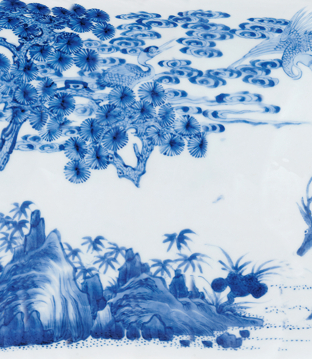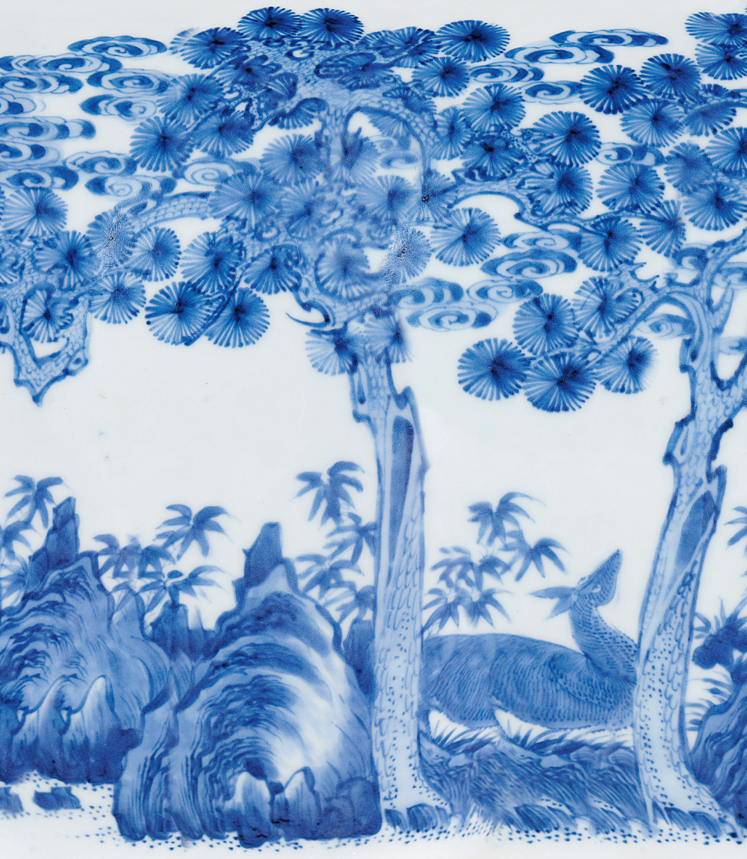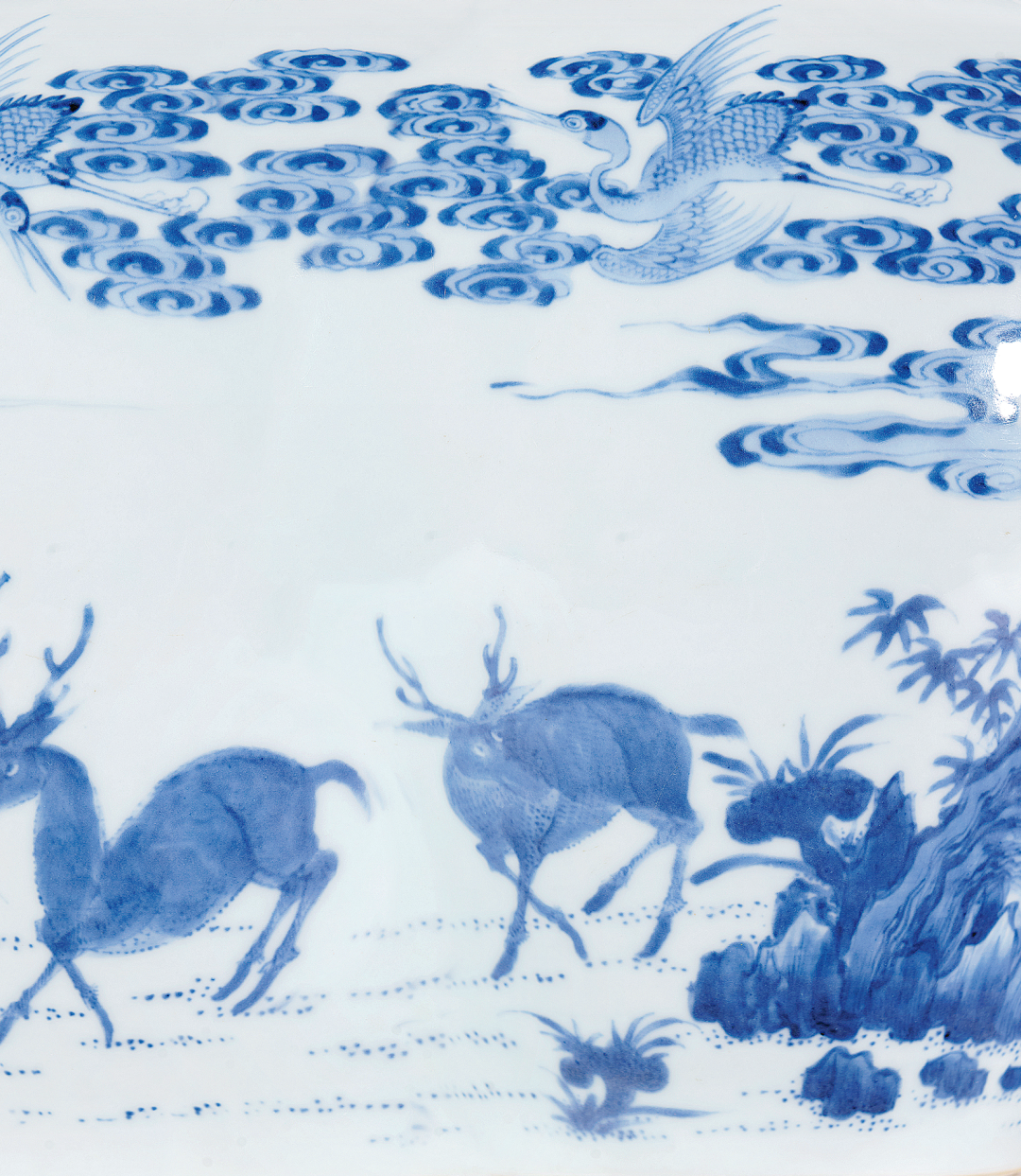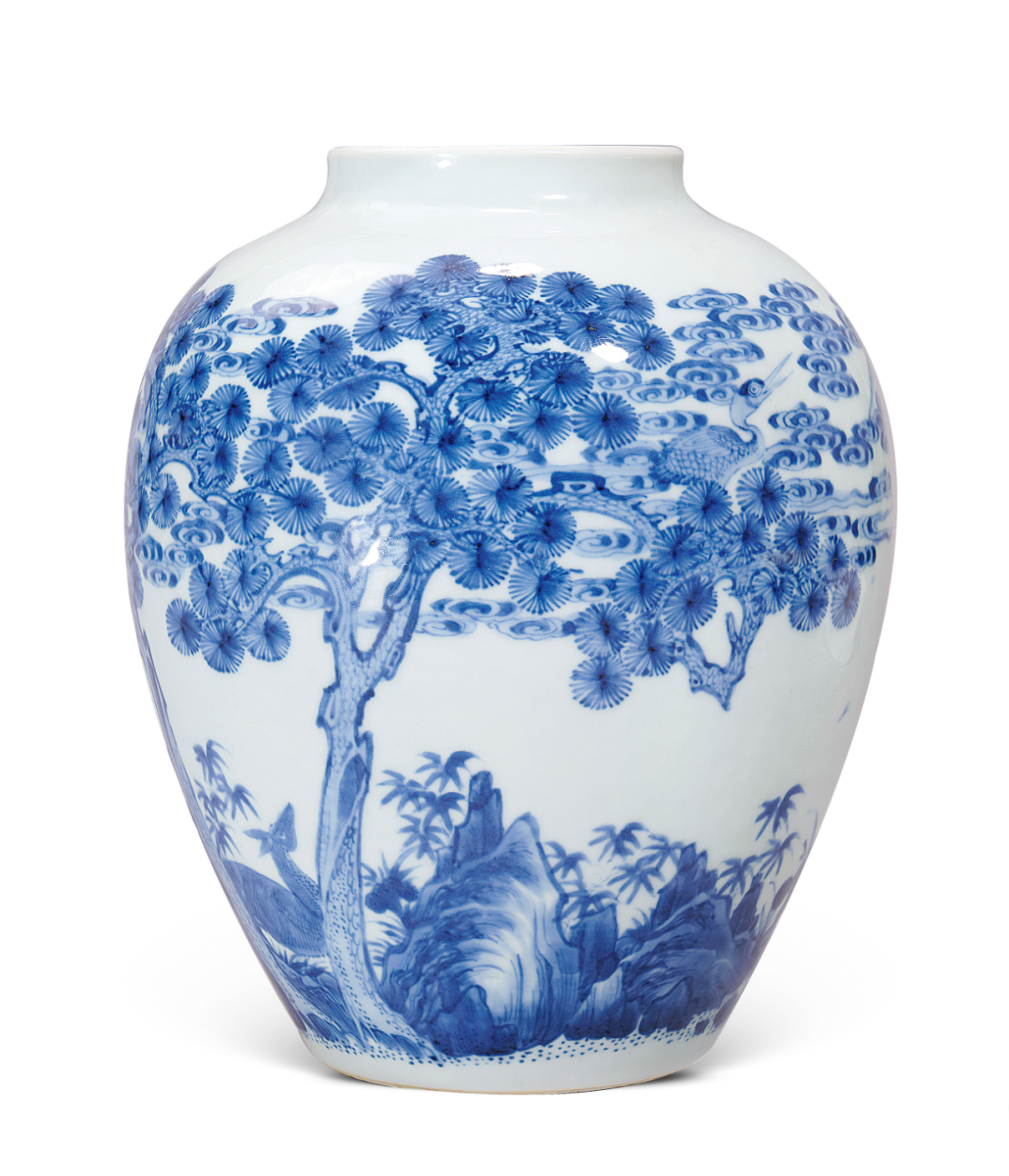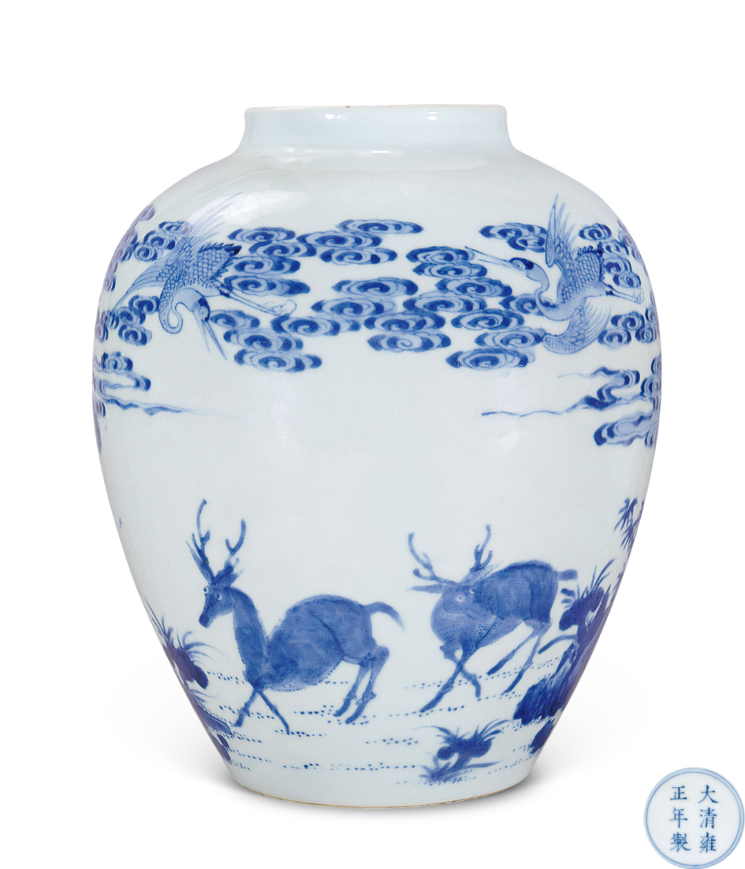 米歇尔·杜尚先生与香港徐展堂先生合影杜尚家族的收藏是在米歇尔·杜尚和女儿安妮·杜尚安妮(Anne Duchange)两代人的基础上建立起來的,米歇尔·杜尚精心钻研中国艺术近七十年,年轻时他已对中国艺术产生浓厚兴趣,于二战结束后积极于欧洲建立其个人收藏,并于1964年于法国巴黎开设第一间古董店,在其女儿安妮·杜尚的协助下,他们多年来累积了各式稀见于市场的中国艺术精品。杜尚曾与多名顶尖古董商交流,包括卢芹斋、Bluett 及Spink and Sparks,著名的徐展堂先生亦是杜尚的坐上客之一。米歇尔·杜尚已于2021年去世,其女儿安妮至今仍然活跃于欧洲的中国艺术圈,不时捐赠收藏或借展予巴黎吉美博物館,为中国艺术收藏作出莫大贡献。罐唇口,溜肩,通身青花为绘「六合同春」图,构图繁而不乱。图中合欢树前瑞鹿回首仰视,与飞翔在天的仙鹤相呼应,另一仙鹤则伫立在梧桐树干上,梧桐枝叶婆娑,生机盎然,虯枝蜿蜒,画面构图饱满,地上叠石错立,翠竹相掩。底部青花双圈内书「大清雍正年制」六字双行楷书款。主题纹饰鹿鹤延年,背景饰以松树、灵芝、祥云等自然景物,无不代表了长寿之寓意,推测此器当时用途或用于祝寿。绘画精美细腻,处处一丝不苟,有如瑞鹿,均以极细之笔触反覆点涂轻画,将鹿毛质感表现得极为逼真,其情态之写实传神,颇为绝妙,又见苍枝之渲染,叠石之层次,均展示非凡的绘画技巧。所绘青花发色浓艳,于莹白滋润的釉面映衬之下,益见清雅逸致。本品寓意吉祥,以鹿、鹤谐音「六合」,所指天地四方(天地和东南西北)故六合同春寄寓天下皆春,万物欣欣向荣之意。「六合同春」图在清代康熙时期民窑青花瓷器之中非常流行,可参见北京故宫博物院典藏品,录于《清顺治康熙朝青花瓷》,页476-477,图307及308。然而,此类装饰题材在康雍乾三朝的清宫御瓷均极为罕见。因此检阅目前所见资料,未见有相同器物。惟见乾隆年款之二例,青花「松石寿鹿」图橄榄瓶售于香港苏富比,2008年4月11日,编号2830;另一例清乾隆青花鶴鹿同春胆式瓶售于北京保利,2010年12月5日,编号4695,可作参考。两者当为同时期御窑厂之佳作。本品原为Jacques Saint-Bris先生收藏,其家族于1854年起为法国中西部昂布瓦斯Chteau of Clos Lucé城堡拥有人,而此城堡为天才李安纳度.达文西离开法国后所移居及1519年病逝之地。
