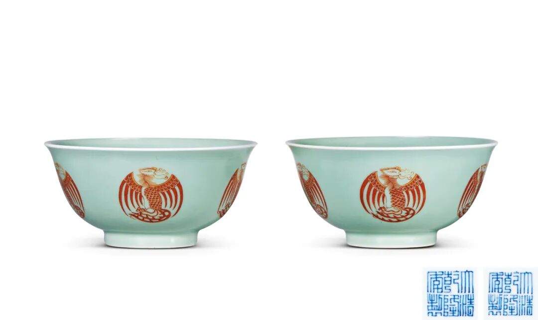 拍品碗口微撇、弧壁、足底施闪青白釉、圈足露胎,胎土淘洗精炼,细腻洁白,胎质坚致缜密,修胎严谨。造型端庄隽秀,线条柔美自然。内外满饰豆青釉,釉面光润,莹泽如玉,温润醇厚,细腻匀净,将豆青釉一色之净美臻纯尽展无遗。外壁以矾红绘五组等距团凤纹,碗心亦饰一团凤纹。凤鸟展翅,凤目尖喙,羽丰尾长,仪表威仪。整体图案布局简洁有序,笔法细腻,绘画生动,色彩醒目,高贵典雅。豆青釉恬翠淡雅,矾红色彩艳丽,对比鲜明,视觉冲击力极强。拍品成对传世,甚为难得。