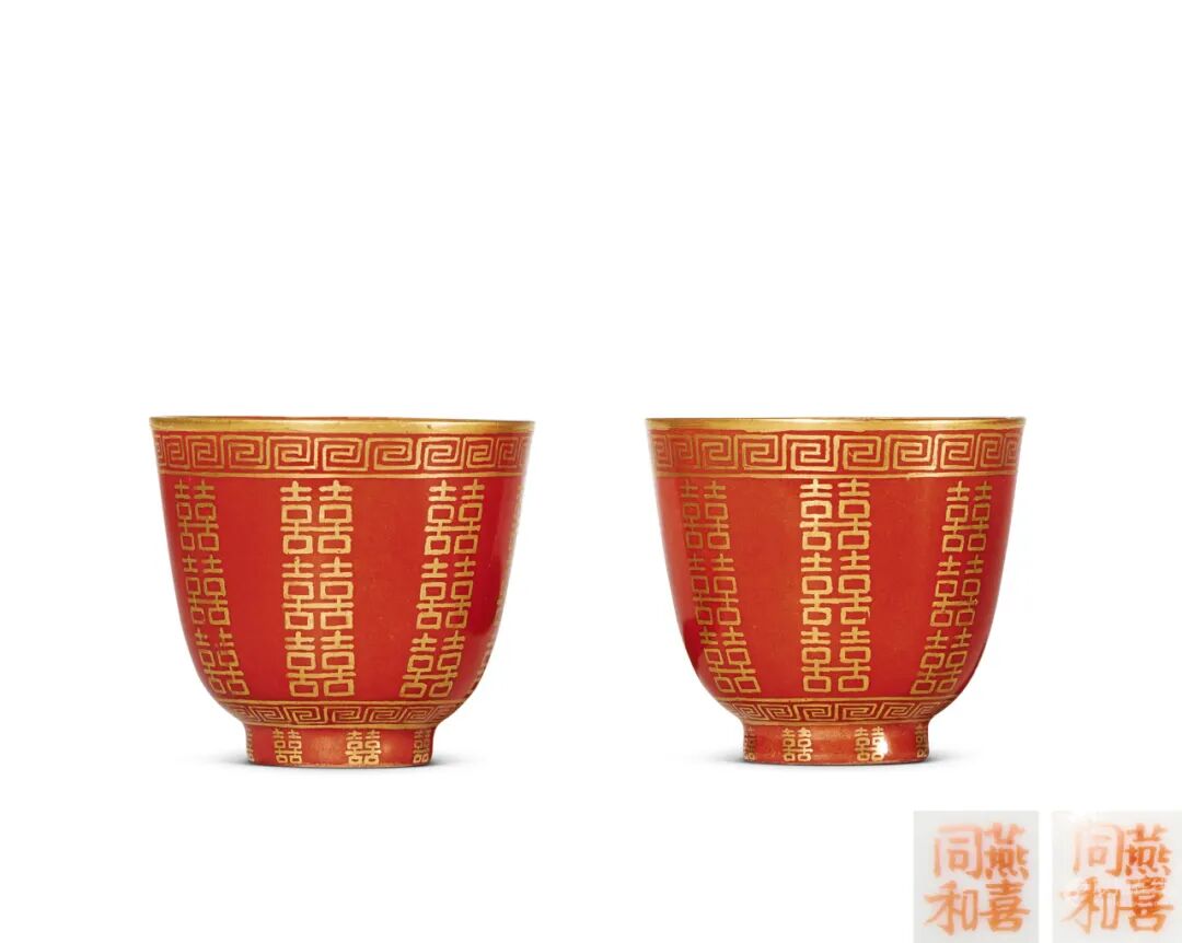 拍品直口、深腹、圈足,内外壁通施珊瑚红釉为地,以金彩装饰双喜纹,内地以金彩饰团寿纹,口沿内外、及近足部皆以描金弦纹与回纹作为边饰,并成对保存传世,极为难得。