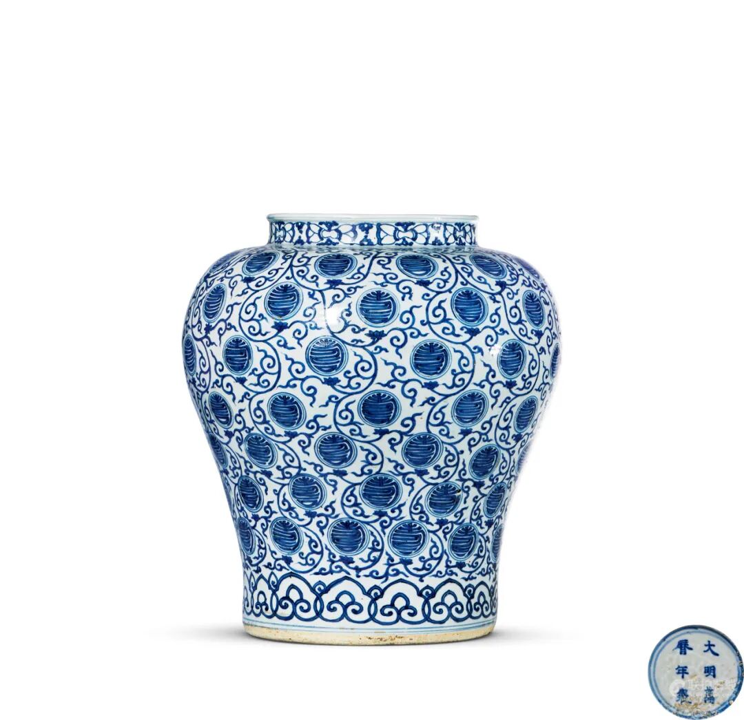 拍品与中国国家博物馆藏明万历青花百寿纹罐,形制、纹饰类似,为万历朝祝寿题材青花陈设大器,时代特征明显,可值珍视。大罐唇口、短颈、丰肩、腹部下收,至足外撇。器型高大壮硕,气势雄浑。通体以青花绘就卷草纹托寿字纹,遍布器身,组成“百寿图”,寓意“百寿延年”,绘画风格具有密不透风之感。此种始见于嘉靖时期,有见青花缠枝莲托百寿字罐,是为迎合嘉靖皇帝增寿的意愿而烧造的大器。