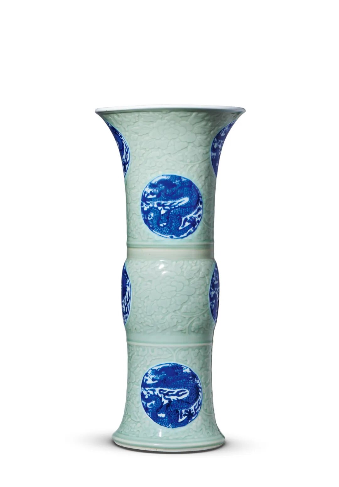 清康熙 豆青釉暗刻牡丹纹青花开窗云龙纹花觚