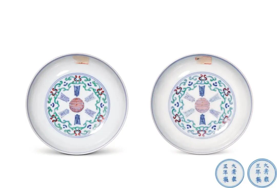 拍品为清代御窑传统品类,于雍正朝创烧,为宫廷寿辰用器。拍品器型周正,通体以斗彩为饰,外壁绘卷草纹一周,形似如意头,其间饰篆体寿字,别具巧思;盘心书斗彩团寿字,环饰六个异体梵文寿字,寓意“福寿绵长”。整器纹饰先以青花勾勒,再以黄、绿、红、赭诸彩填色,设色丰富,色彩恬淡,疏密有致,主题鲜明。成对传世,殊堪宝藏。