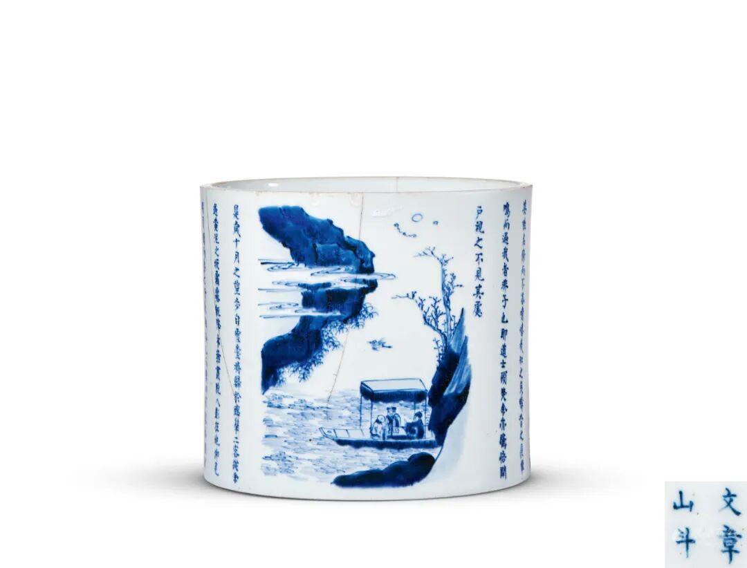 本品口底相若、筒形腹、玉璧形底,造型端庄周正。通体以青花为饰,其外壁一面饰有夜游赤壁图,月亮高挂,流云缭绕,绝壁高悬,苏东坡、黄庭坚、与佛印三人乘船赏月;另一面以楷体书有《后赤壁赋》全文,书写工整,诗文笔意流畅,字体间架得当,诗画相辅相成,互为映衬,格调高雅,实为康熙文房精品之作。