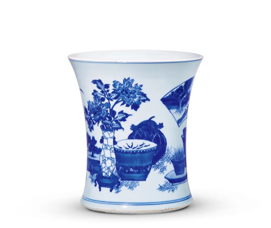另有清康熙 青花“赤壁赋”诗文笔筒,来源清晰,文人气韵浓厚,以及清雍正 青花团龙纹纸篓、明中期 青花瑞兽纹象耳香炉、明万历 青花莲托百寿纹大罐、清康熙 豆青釉暗刻牡丹纹青花开窗云龙纹花觚、明崇祯 青花博古清供图笔筒等精品,值得关注。