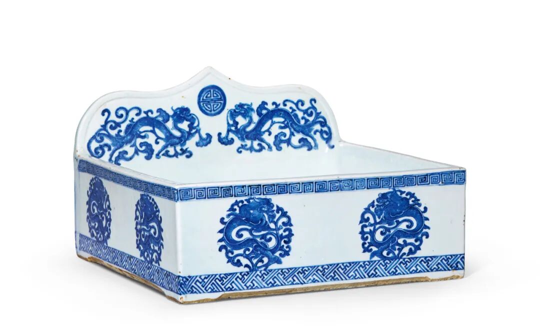拍品即为文房之中少见佳器,以作存放文人墨客重要手稿信札类等物之用。此件拍品造型新颖,呈以正方器形,内壁施白釉,砂底,通体以青花绘就纹饰。后侧向上引伸出如意云头形,构成挡板,其内并饰以双螭龙捧寿纹。外壁四面饰以回纹、锦地纹作为边饰,整体围绕一周,其内皆饰以螭龙团花纹样。每个侧面螭爪握花卉,十分别致,挡板饰双螭龙捧寿纹,可寓幼子承托起“福寿”之意,所有纹样布局对称,又有花卉缠绕,意指循环往复,生生不息。整体绘画细腻,用途独特,青花发色浓艳,纹饰密集点染,意在仿永宣青花之特征,极显雍朝仿古之情趣。