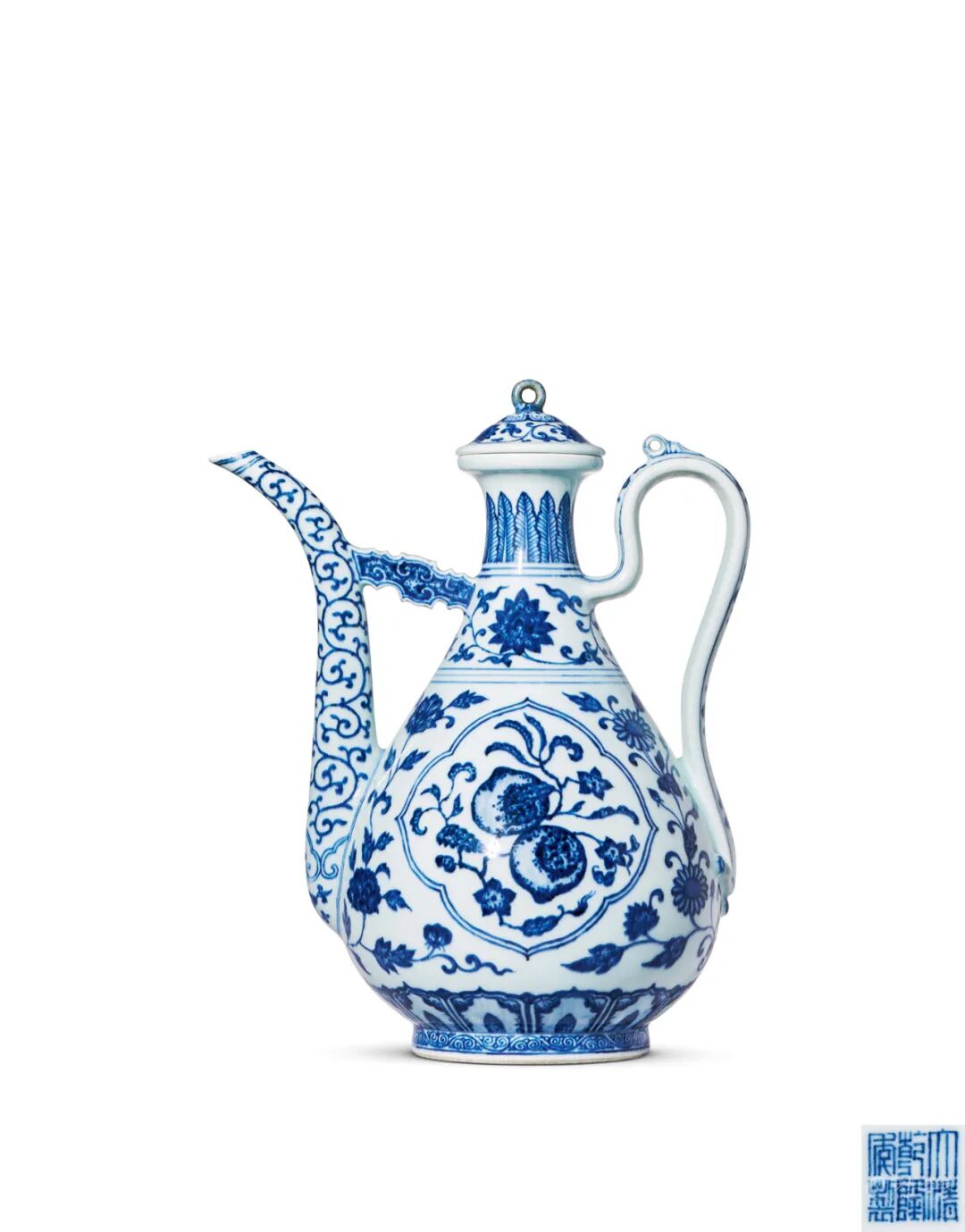 拍品造型、尺寸及工艺与南京博物院藏清乾隆青花开光瑞果纹执壶相同,为清代御窑之典范,首见于乾隆早期,盛行于嘉道二朝,止烧于道光二十五年。在乾隆前期每年烧造约有五六对,乾隆后期至嘉庆一朝则保持在四对以内,入道光朝之后,每年仅烧三、四件。其中质量最精者当为乾隆所烧之物。本品属于乾隆朝同类器上佳之作,殊为可贵。清代宫廷以明初青花之苍雅深沉为上,因无法区分永、宣之别,故而皆称“宣窑”,并以其为范本,多次命景德镇御窑厂仿烧。
