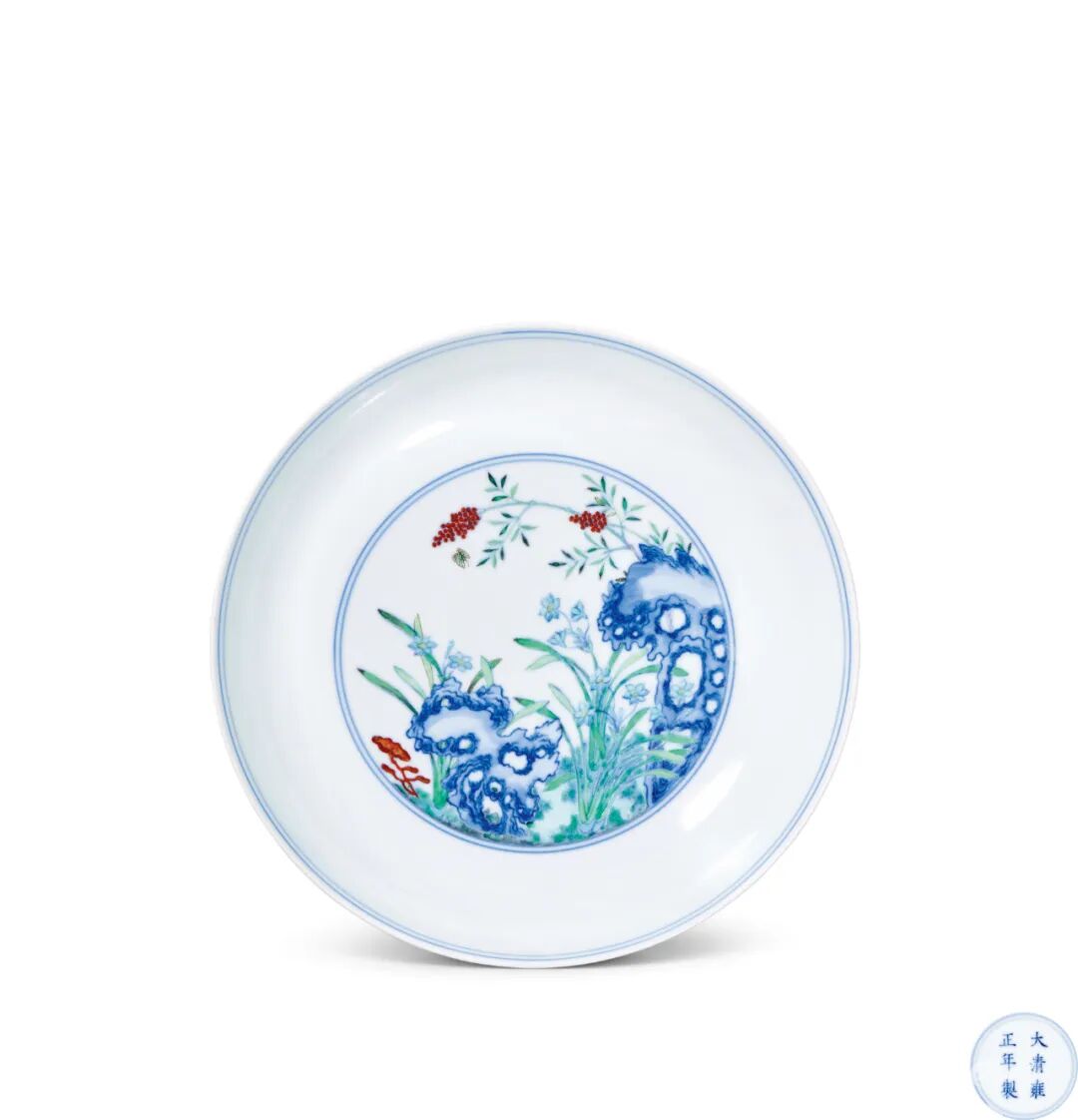 拍品为著名收藏家徐展堂先生旧藏,并出版于《徐氏艺术馆陶瓷Ⅳ·清代》一书中。形制端秀、敞口、圈足,胎质细薄轻盈,釉汁莹润如玉。通体以釉下青花与淡雅明亮、不同色阶的绿彩为主色调装饰,盘心绘灵仙祝寿图,画面中高低洞石玲珑对立,上有天竺二枝横欹而出,硕果累累,下见水仙吐萼含苞,掩映其中,更现灵芝倚石而生。以矾红彩及淡黄彩分别点缀水仙花蕊、天竹及灵芝,以淡墨彩渲染水仙、天竹茎叶的阴阳向背。盘外壁分绘灵竹寿石、芝仙寿石以及天竹寿石三组图案,寓意“灵仙祝寿”,喜庆吉祥。整器笔触清秀细腻,设色淡雅逸丽,构图颇得虚实之妙,图中春色盎然,宛若和风拂面,醉人心扉。当中洞石之绘画水平堪称雍正御瓷之最,运笔苍劲,皴法多变,点染细致,质感如真。底书青花「大清雍正年制」六字双行楷书款。结字工整,端秀严谨。