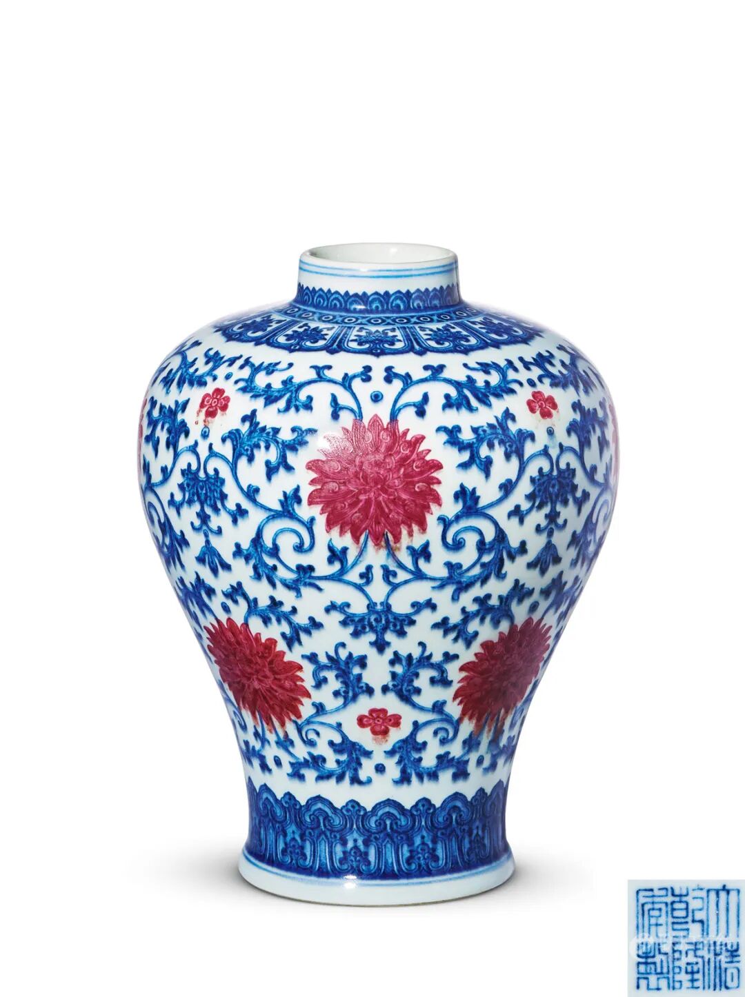 拍品为乾隆官窑仿永宣之绝佳上乘之作,造型及纹饰与清宫旧藏清乾隆青花釉里红缠枝莲纹梅瓶相同。瓶腹饰满缠枝莲纹,莲花硕大饱满,莲瓣层层展颜,柔美娇嫩,莲叶舒展,缠绕于花间,其中朵莲以釉里红打底,烧成后于其上加饰胭脂红彩,将细节表现的淋漓尽致,尤为艳丽。本品具有显著的清乾隆时期梅瓶的特征,肩部特别丰满,腹下收弧度较大,形制极为丰腴端庄,其纹饰、青花发色带有明显明永宣青花烧造的特点,重笔点染,发色晕染,色泽明快、浓艳,极为美观。加之本品递藏有序,实为难得一件的收藏佳品。