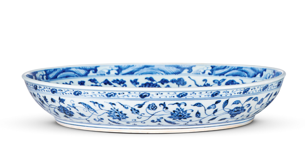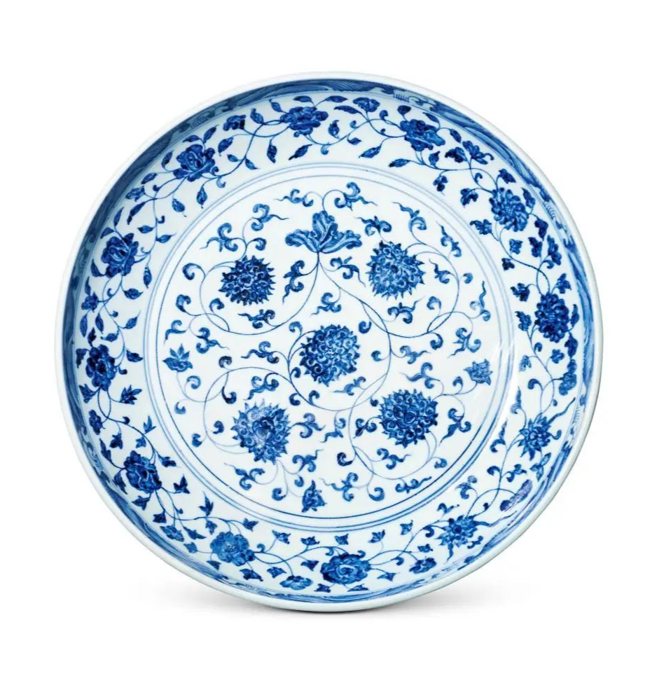 拍品形制、纹饰及尺寸与德国汉堡艺术馆藏明永乐青花缠枝莲纹盘相同,为永宣瓷器经典式样。造型端庄,胎质细腻,釉汁莹润,盘内口沿饰一周海浪纹,内外壁饰以缠枝花卉纹,盘心主题纹饰构图为一株莲花位居中心,四花拱卫,其线条纤细,朵莲妍开,勾画婉转流畅,分布匀称,藤蔓纤纤,疏朗饱满。线条粗细并用,青料浓淡兼施,画面富具苍翠欲滴的意趣,透出凝重雄浑之美,一如朱明盛世,众星捧月,威加四海之意。青花呈色极富层次,铁锈斑深入胎骨,为同类器之精品佳作。