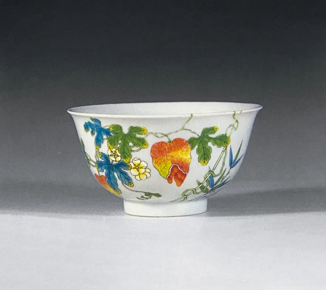 癞瓜又称癞葡萄、野葡萄,与苦瓜同科而不同种,瓜面颗粒状凸起,成熟时颜色鲜艳,自然开裂,露出鲜红的瓜瓤,其籽多而饱满,故被认为有多子多福的美好寓意,于清代常作为吉祥纹饰使用。粉彩过枝癞瓜碗创烧于清乾隆时期,是清代官窑经典制式。故宫博物院现存一百零九张瓷器画样中,即有此一品种民国许之衡《饮流斋说瓷》中曾赞誉曰:“过枝花之杯、碗,乾隆者尤绵密,癞瓜牵藤,间夹翠竹,繁丽中殊有玲珑剔透之致。”