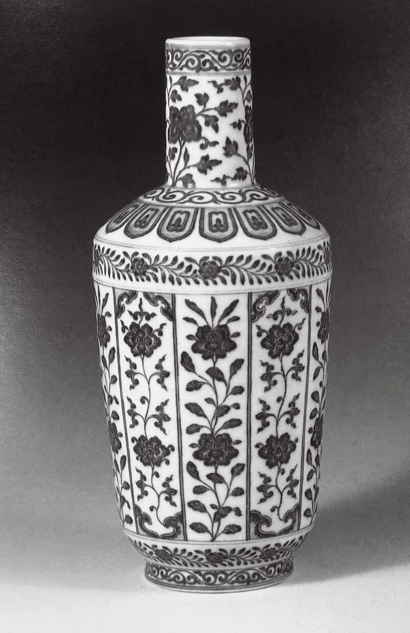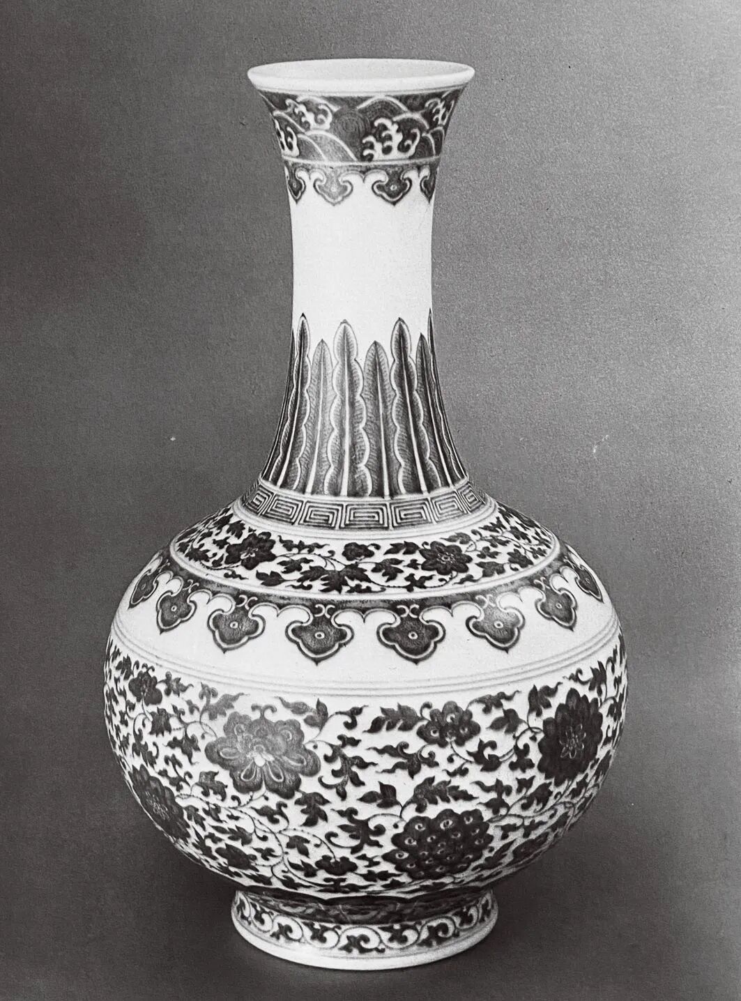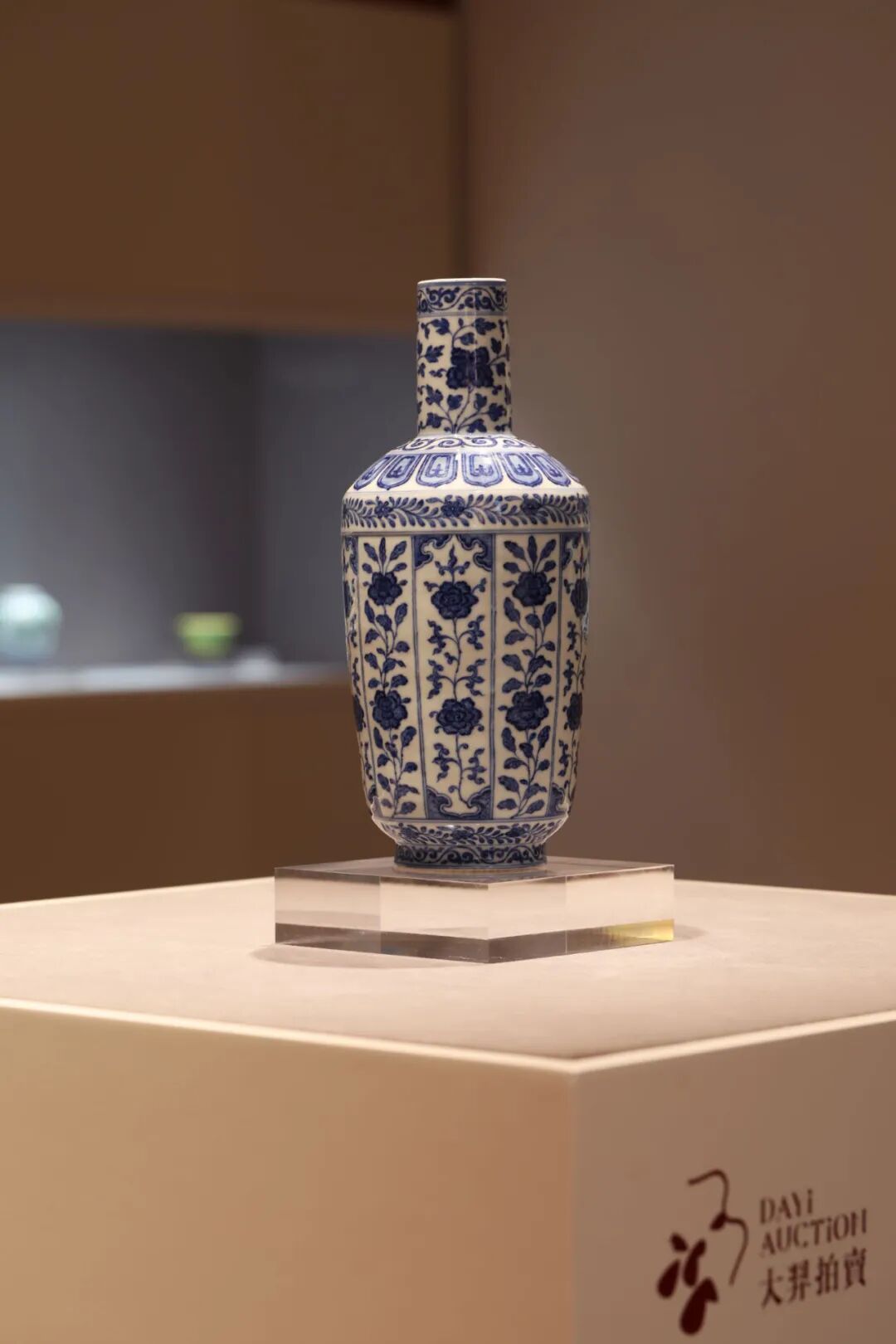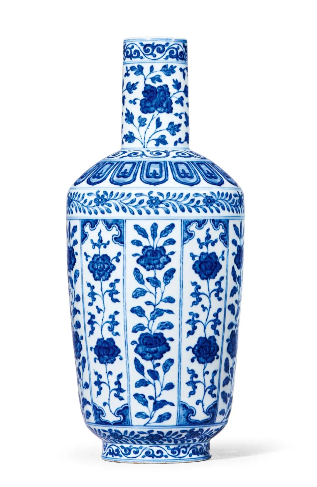 拍品估价:600,000 - 800,000 人民币记录:香港佳士得,2010年5月31日,编号20001.《晚清官窑瓷器》,香港中文大学文物馆,1983年,页50,图162.《清代瓷器赏鉴》,上海科学技术出版社,1999年,页214,图274玉堂春瓶创烧于雍正时期,因其外形俊秀、线条柔美、比例协调,深得清朝历代君王的喜爱。其器形为雍正督窑官唐英“参古今之式,动以新意,备储巧妙”而奉旨审定的款式。初名“玉堂春瓶”,因雍正帝专用于赏赐功臣,赏瓶成了“玉堂春瓶”的专指代称。其后历朝持续烧造,一直沿用至清末,为清代官窑的经典陈设用器,也兼赏赐臣工之用。据《清宫造办处活计清档》载,雍正八年(1730)“十月三十日,海望奉旨……将赏用瓷瓶亦画样呈览,交年希尧烧造些来……”,即指此一品种。赏瓶撇口,细长颈,腹部圆鼓。通体以青花为饰,自上而下分别绘海水纹、如意头纹、蕉叶纹、回纹、缠枝莲纹、如意头纹、缠枝花卉纹、莲瓣纹、卷草纹等九层纹饰。器形规整,胎质坚致,白釉莹润,青花发色明艳稳定,纹饰繁复,层次分明,画工点染细腻。所见青花缠枝花卉纹赏瓶有两种,器形、纹饰略有不同,一类源自雍正时期,腹部缠枝花卉纹为单层,肩部有三组凸棱,上腹硕,下腹渐收;另一类为乾隆时期的革新样式,腹部缠枝花卉纹为双层,肩部无凸棱,腹部浑圆,嘉庆、道光时期多为此式,拍品亦不例外。陈玉阶(Y.C.CHEN,1922-2012),江苏江都人,香港著名收藏家。上世纪三十年代,十五岁的陈玉阶拜于上海晋古斋朱鹤亭门下,朱鹤亭是与张宗宪先生的父亲张仲英一样的民国时期著名古董商,收藏大家仇焱之也是朱鹤亭的学徒。陈先生自涉猎古董一行,宵衣旰食,苦心学习与钻研行业知识。五十年代初陈玉阶定居香港,从事古玩行业,与暂得楼胡惠春、天民楼葛士翘、赵从衍等知名藏家交往甚笃。陈玉阶先生收藏广博,触类旁通,尤其是在瓷器收藏和鉴赏方面有丰富的经验和独到的审美品位。其钻研古陶瓷既注重科学手法,又着重参考文献,无论唐宋高古瓷,还是明清官民窑瓷器,皆费尽心血,潜心研究。因此陈氏所藏,均颇受市场追捧。