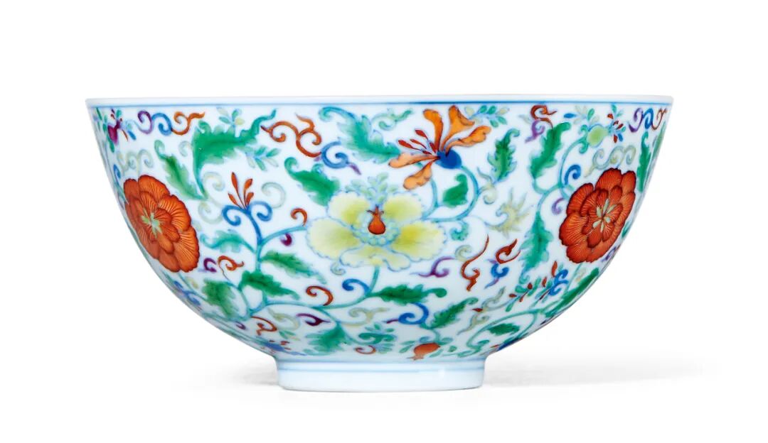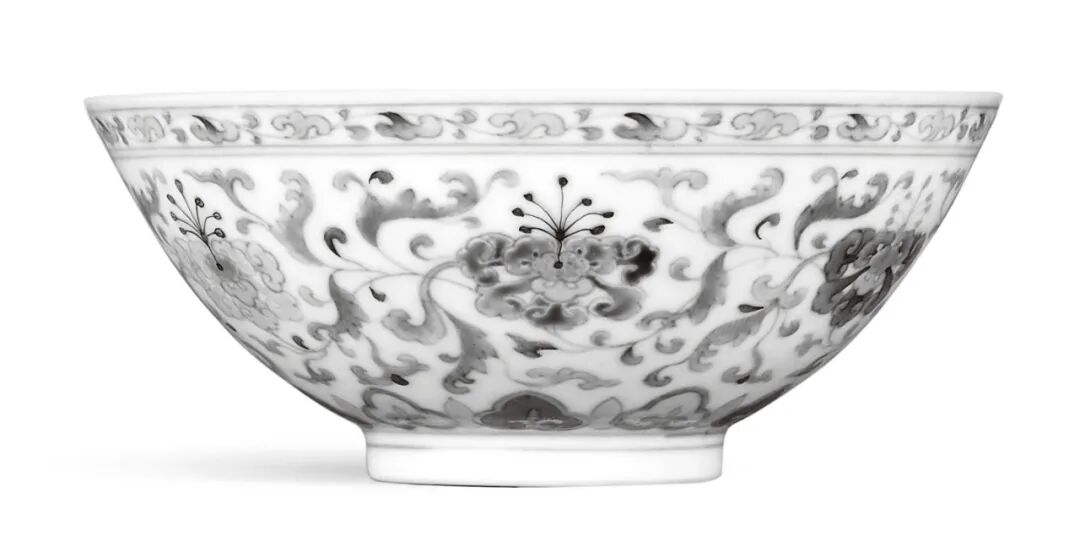 本品器型以成窑宫碗为摹本,线条柔美,其胎釉精良,温润似玉。成窑冠绝千古,成就中国美学之典范,后世对此推崇不已,由仰慕而后摹造,佳作迭出,其中成就最著者当推雍正皇帝。其品味脱俗超群,审美要求近乎苛刻,即位以来一直不懈努力推动与指导御窑厂摹制成窑,故其所仿最精,形神俱佳,本品正是此番摹古情怀的最佳诠释。纹饰方面,本品则融入了十八世纪清宫盛行的西洋风。彼时诸项宫廷艺术品的装饰皆不同程度融入西洋元素,雍正御窑斗彩瓷器,不但以仿明成化斗彩为能事,也钟情以洋花洋草入饰,效果新奇别致,展示出御瓷纹饰设计的新姿彩,成为雍正彩瓷之中瑰丽新颖的一类。纵观有清一代君主,雍正帝胤禛是最具艺术才华的皇帝,其审美品位之高独步古今,所制御窑瓷器深受其影响,素以精巧淡雅、清新脱俗着称。彩瓷设色之难尤甚,浓艳过度流于媚俗,淡薄不足失却本意,唯独雍正一朝画笔逸丽,构图别具一格,将两者巧妙融汇于一体,本品即为最佳代表。
