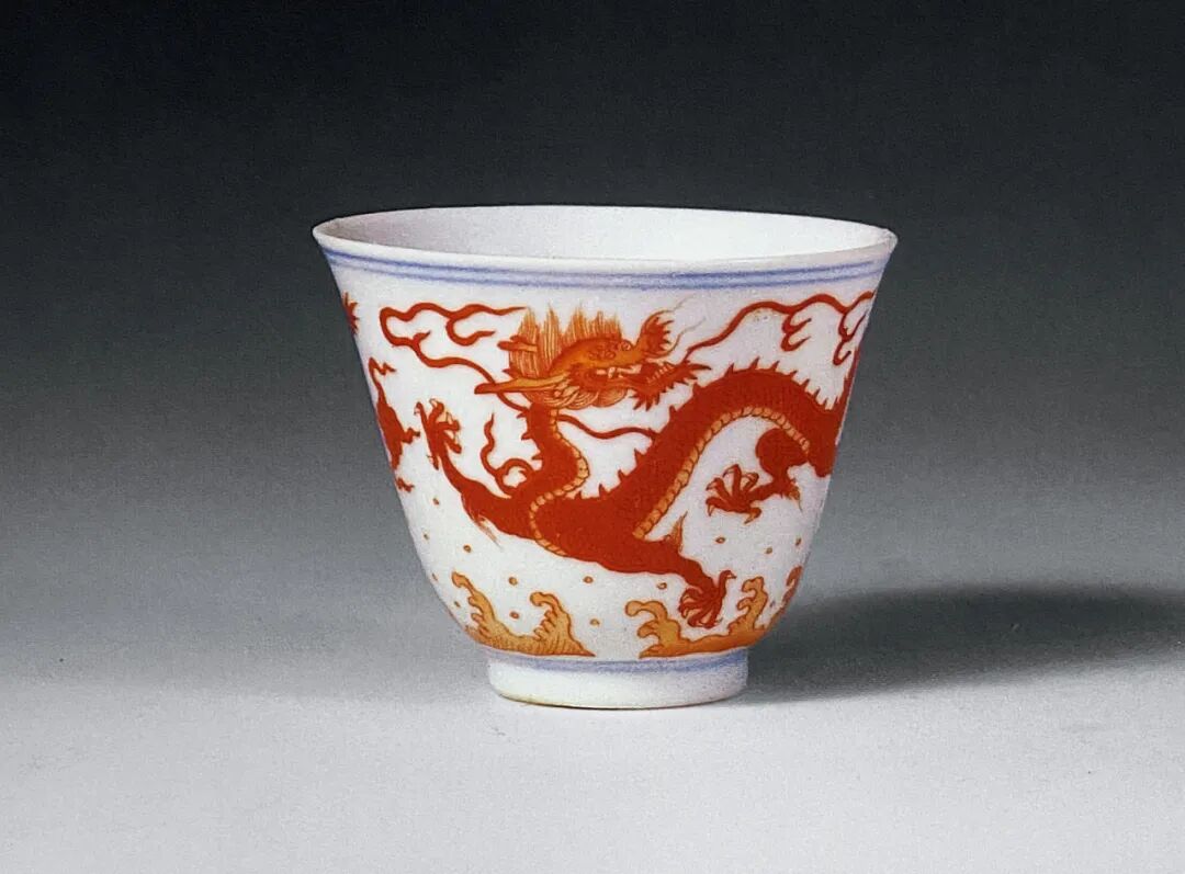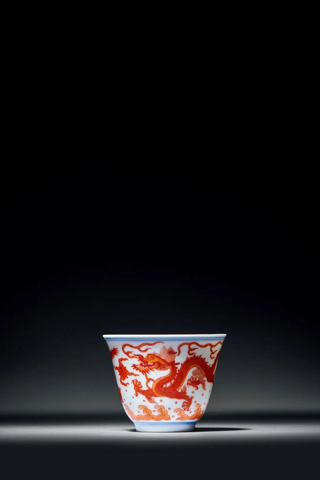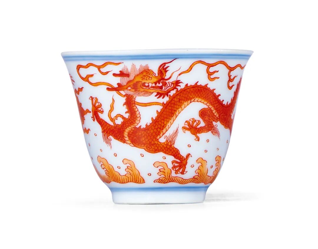 拍品撇口,深弧腹,圈足。胎质细腻,釉色莹白。口沿及近圈足处以青花各绘弦纹两道,外壁描绘矾红龙纹,龙身矫健,弯曲灵动,双目圆瞪,充满精神;周边衬以火云纹和祥云缭绕,下方描绘海水波浪纹,波浪描绘细腻,层叠推进,汹涌袭来,生动逼真。笔法娴熟流畅,为乾隆御窑佳器。