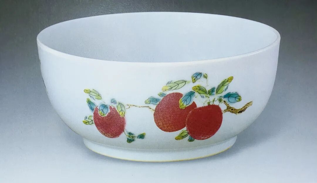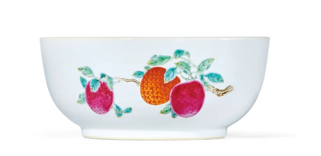 此拍品无论造型、彩绘技法还是纹饰,都达到粉彩空前的高度,堪称粉彩瓷器的代表佳作。拍品直壁深腹,矮圈足,呈墩式,足脊露胎,呈浑圆的“泥鳅背”状。通体施白釉,釉质洁白,外壁以粉彩绘折枝荔枝、寿桃、石榴为饰,寓意甚好,笔触细致入微,色彩鲜艳柔丽,浓淡相宜,层次清晰而富有立体感。荔枝、桃子、石榴三种果实合在一起,称“三多纹”、“连中三元纹”或“多子连元纹”,寓子孙科场得意、诸事顺遂之含义。