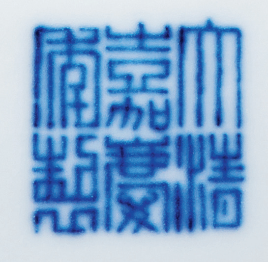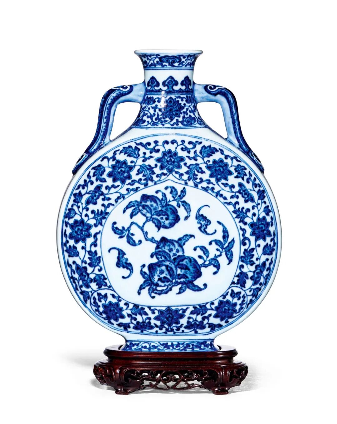 拍品估价:600,000 - 800,000 人民币参阅:《故宫博物院藏文物珍品大系—青花釉里红》下,上海科学技术出版社,2000年,页162,图148拍品胎质坚白细润,施釉莹润肥厚,青花发色纯正艳丽,画工精美,细腻而不失大方。瓶自口部开始分层装饰,口沿饰卷草纹,颈部绕一周如意云头纹,之下一圈缠枝花草铺展垂肩,瓶腹前后绘缠枝西番莲,中部桃形开光内绘五枚蟠桃,枝叶垂垂,生机犹存。四周蝠纹围绕,轻灵秀逸。福寿双全为清代典型祥瑞图案。《周书·洪范》有解:“五福,一曰寿,二曰福,三曰康宁,四曰攸好德,五曰考终命”。“攸好德”是“所好者德也”的意思,“考终命”是有善终。所以画蝙蝠围着寿字或围着桃子,寓意多福多寿,福寿双全之意。蝙蝠之“蝠”与“福”字同音,故以蝠代表福。清代自嘉庆朝起,大清王朝的综合国力明显下降。为了节省开支,朝廷已不再向御窑厂派专司其事的督陶官,御窑厂的规模、瓷器品种和数量上大为缩减。但一些官窑器作为宫中生活、陈设用瓷,其制作仍是非常严格的,这件青花福寿双全抱月瓶就保持了较高的工艺水平。其工艺精湛,绘功纯熟,呈色优美,寓意祥瑞,瓶底以青花书六字篆书「大清嘉庆年制」六字三行篆书款,是嘉庆年间的御用陈设瓷器。
