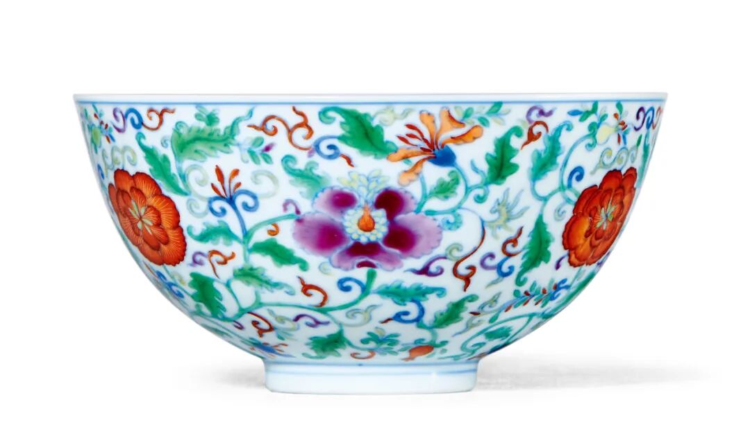 拍品估价:500,000 - 800,000 人民币参阅:香港苏富比,1993年10月26日,编号152本拍品为西洋纹饰与中国制瓷技术交汇之佳作。碗敞口,深弧腹,圈足。外壁以斗彩绘六朵缠枝西洋花卉,分别以鹅黄、浅紫、矾红三色填绘花瓣,花蕊高凸,别致瞩目,以青花勾勒枝蔓,以绿料填描花叶,碗心绘同式样花卉一朵,与外壁纹饰交相辉映。其布局清新疏朗,填色精准,青花明亮静恬,红彩纯正匀净,绿彩娇嫩青翠,黄彩明快润泽,紫彩华贵沉静,诸彩交映出淡雅柔和、臻于至美的内廷恭造风格。其型轻盈优美,修胎极为规整考究,胎釉浑然一体,丽质非凡,荡漾出雍正御瓷独有的阴柔婉约之气。